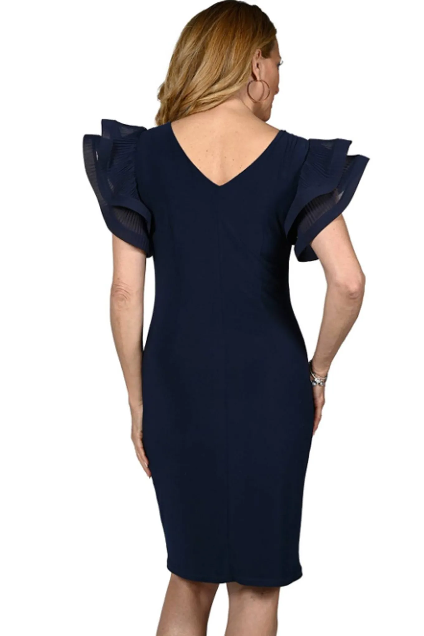 - Smuk kjole fra Frank Lyman med en lækker blød kvalitet og en let tætsiddende pasform. Kjolen har også rund hals og er detaljeret med dramatisk flæser omkring ærmerne.