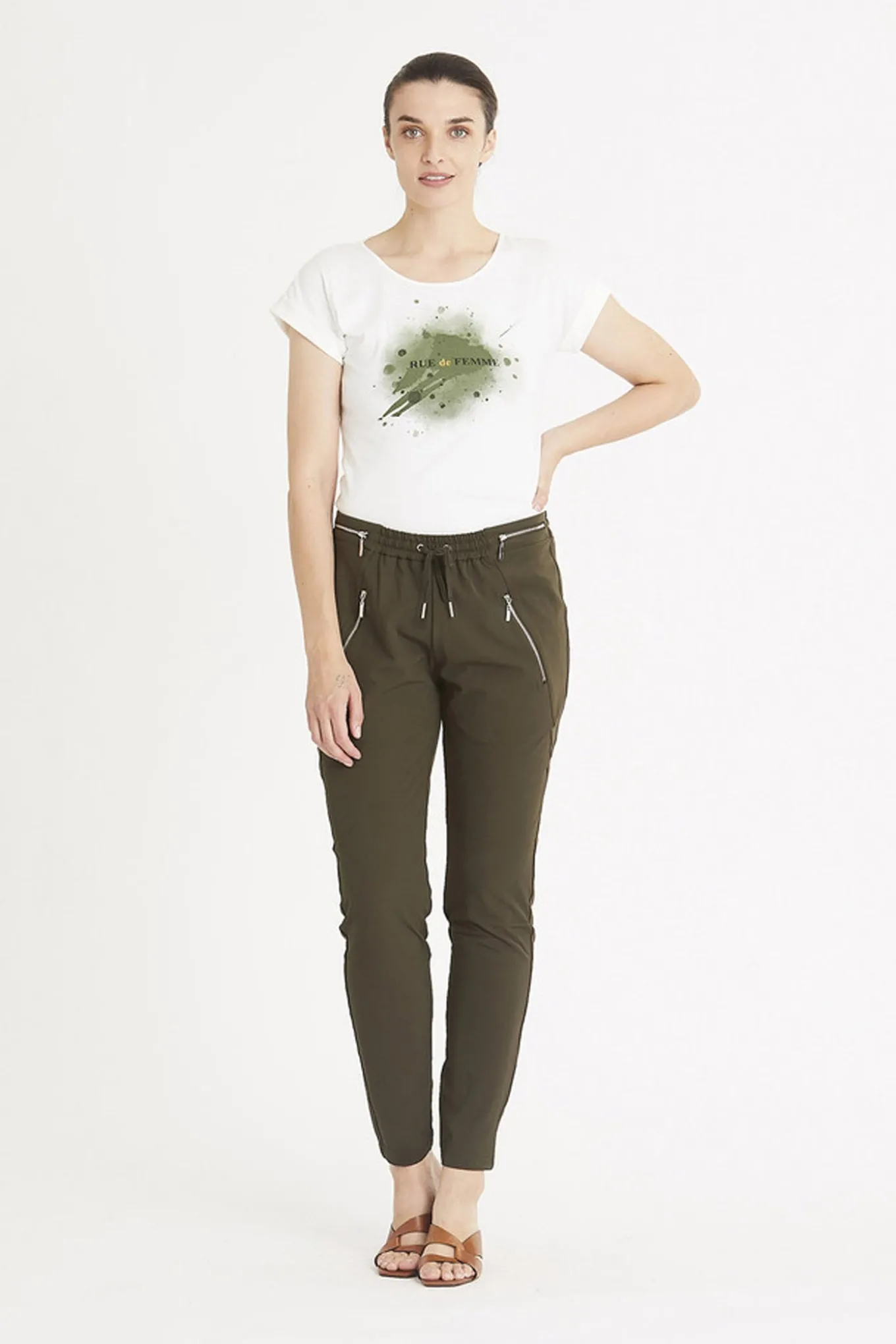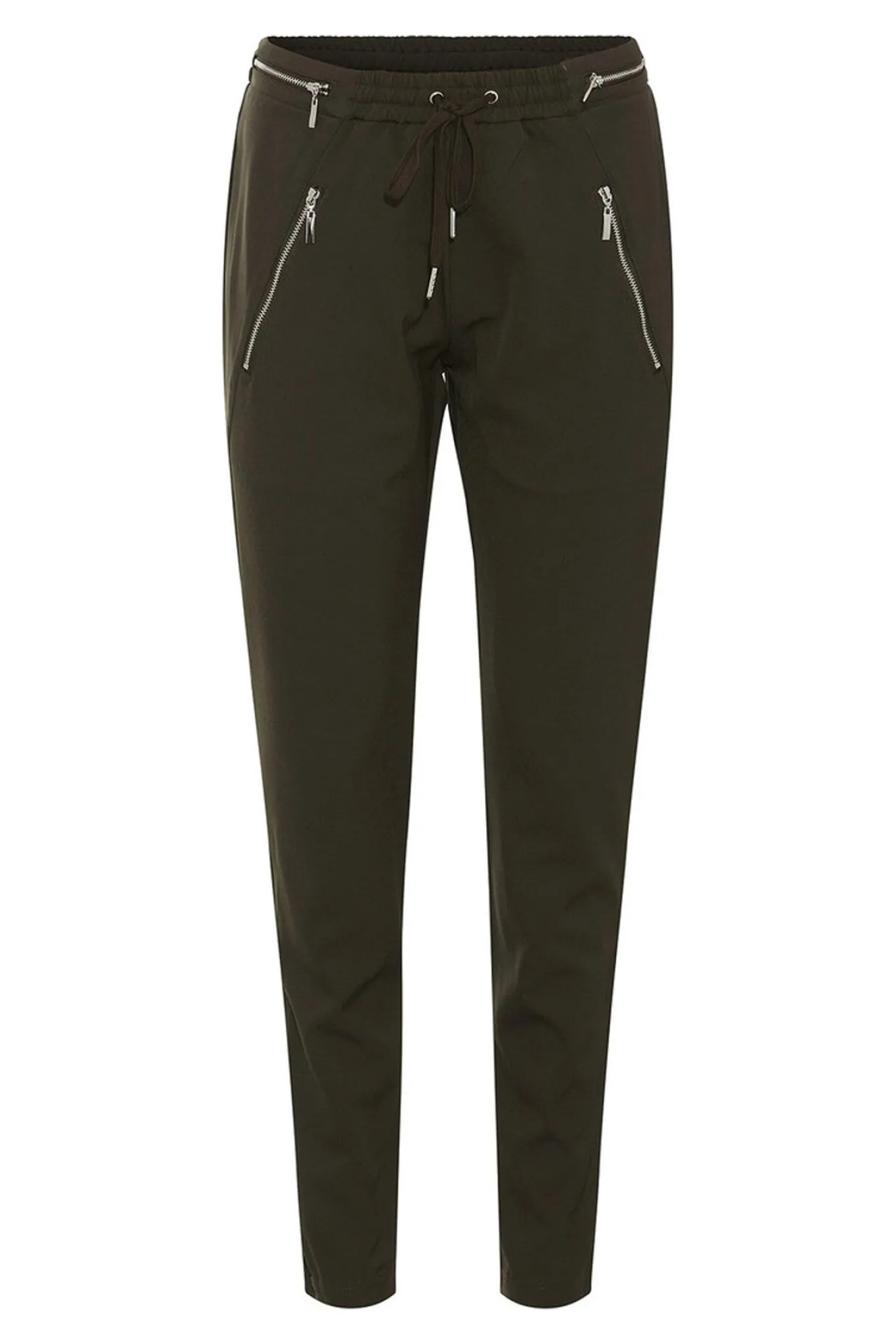 OBS! Fjernlager. Levering kan blive forlænget med 2-3 dage, hvis varen ikke findes i vores butik lige nu. Casual bukser fra Rue de Femme med et strejf af luksus. Lynlåse i sølv på taljen og lommerne tilføjer en subtil glans til det afslappede design.