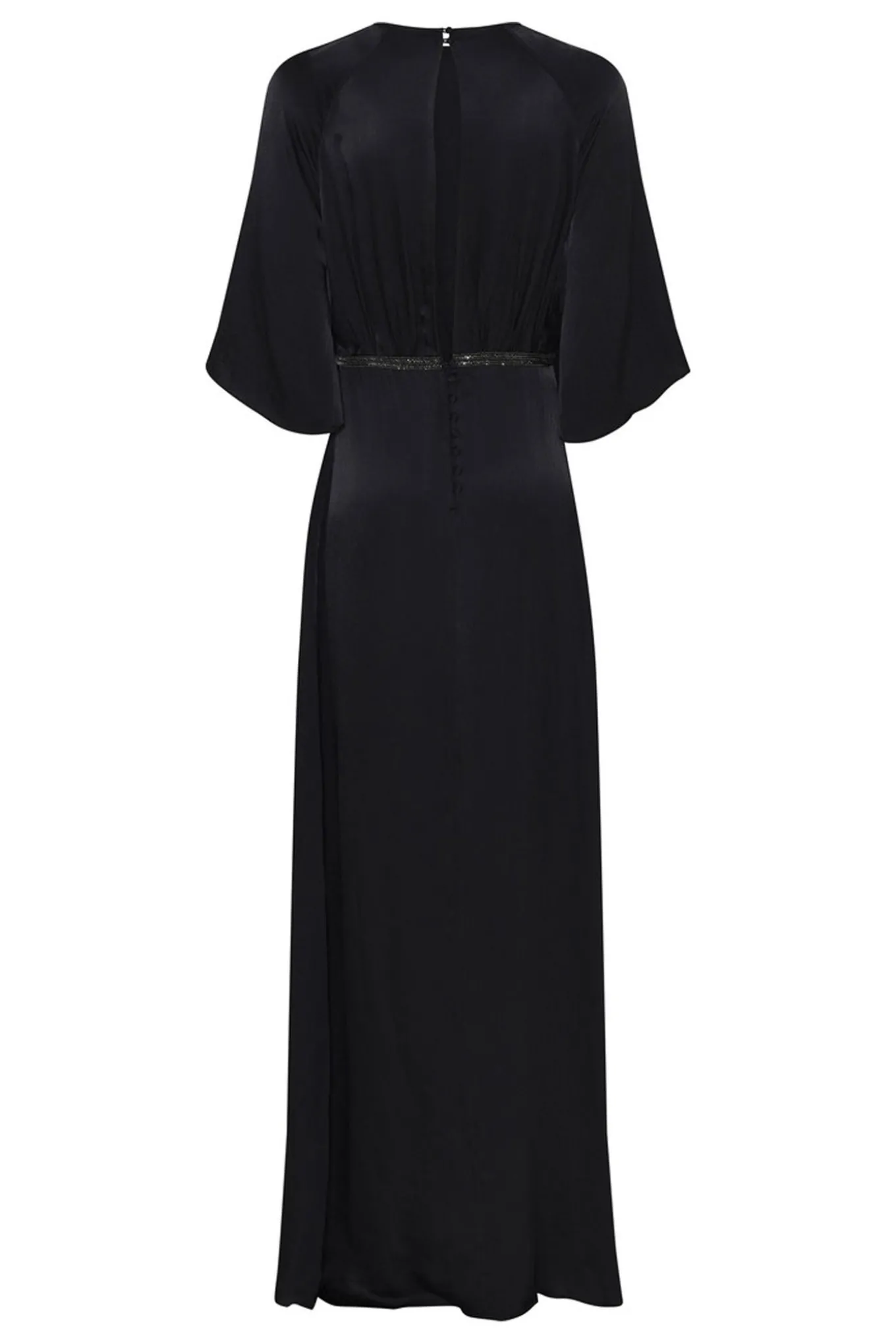 Elegant maxikjole fra Heartmade med rund halsudskæring og korte raglanærmer. Designet har en flatterende elastikdetalje i taljen og en flydende silhuet, der falder smukt.