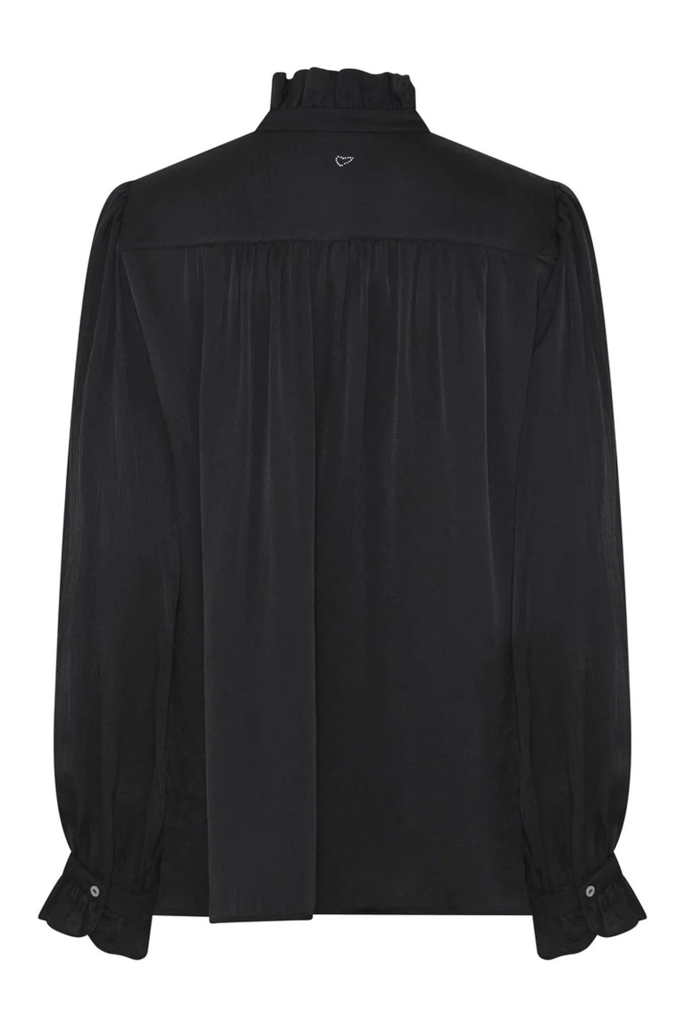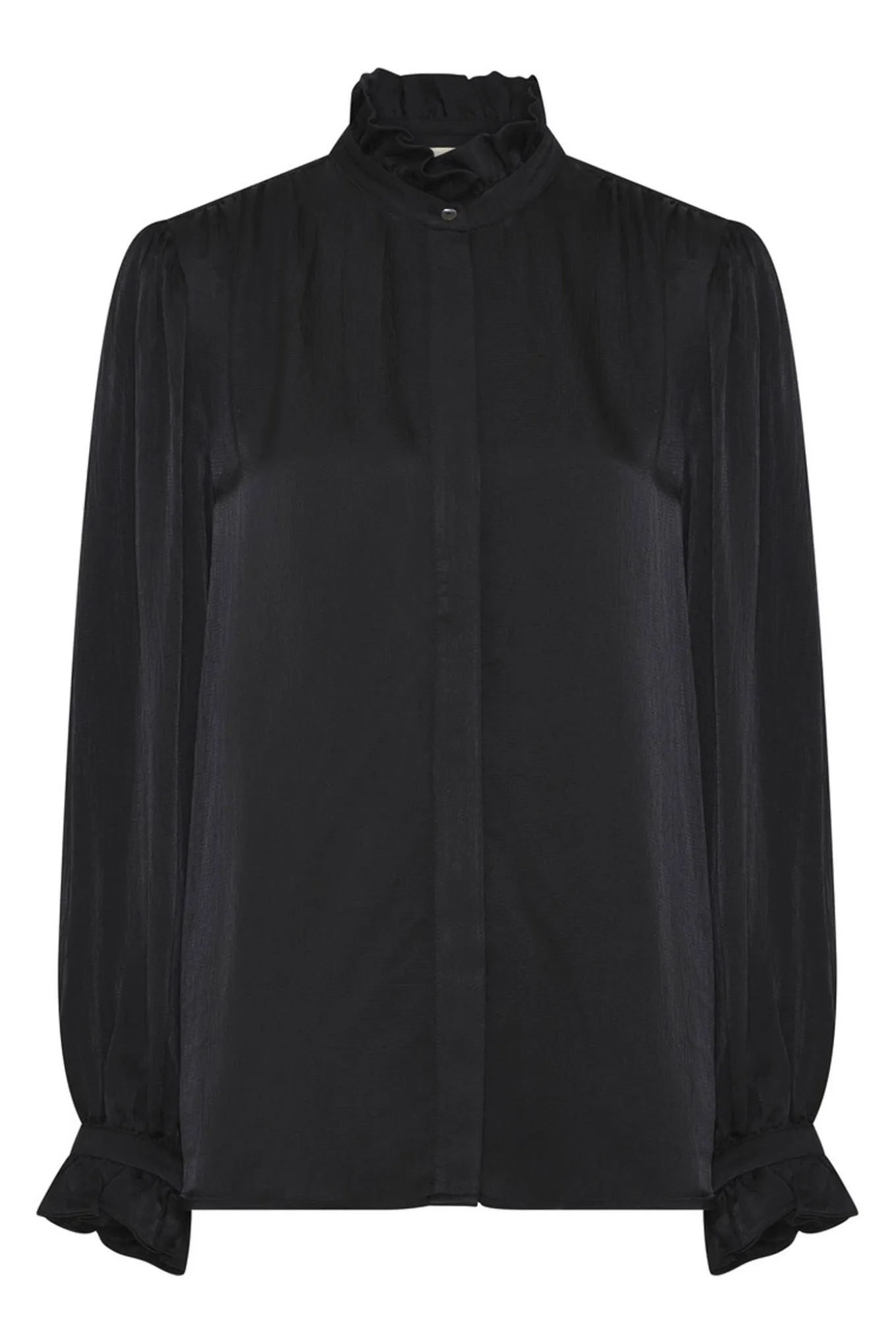 Elegant skjorte i en let skinnende kvalitet med en høj, blød krave og skjulte knapper, der understreger et sofistikeret udtryk.