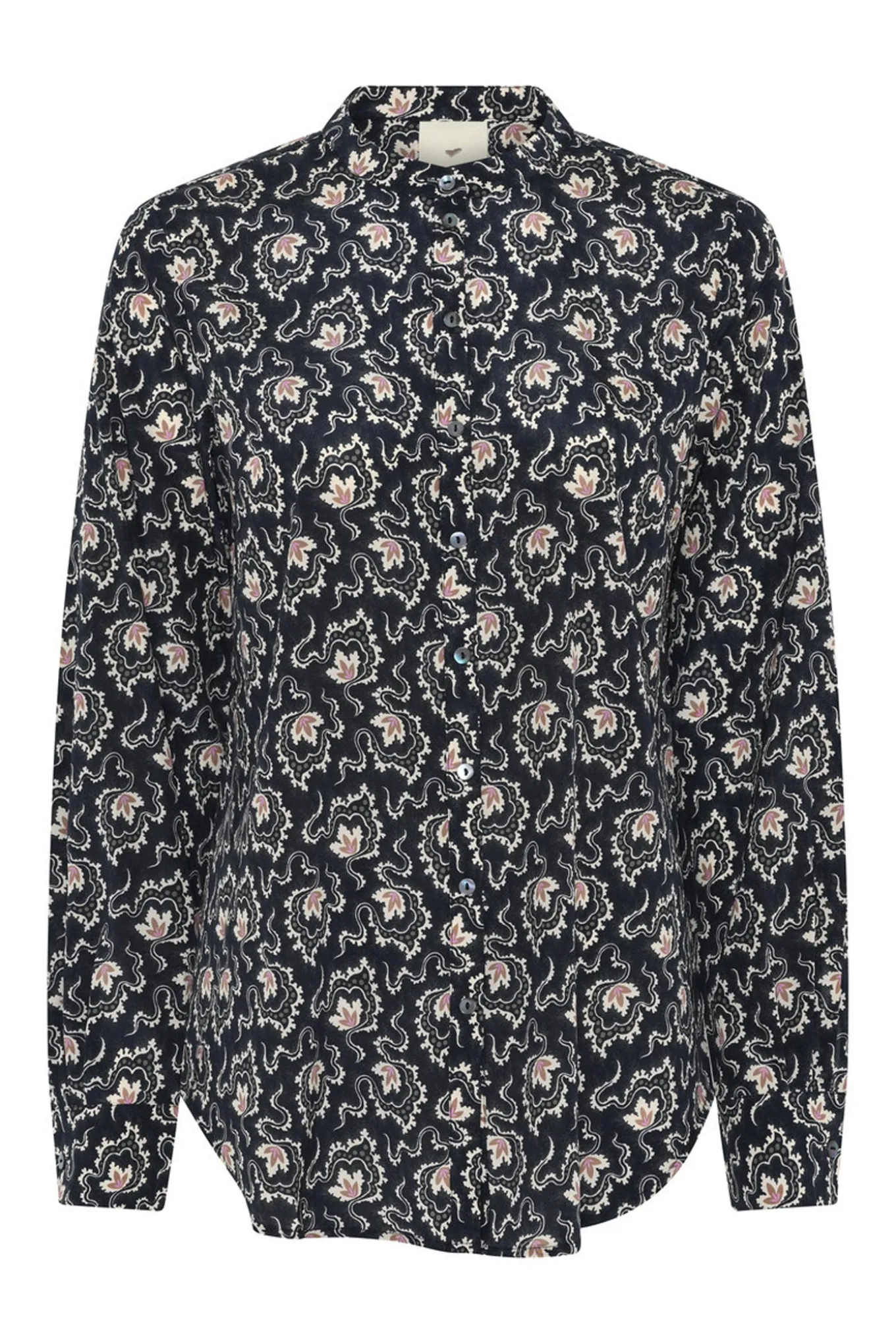 Oplev luksuriøs komfort med denne Navy Dekor bluse fra Heartmade. Fremstillet af 93% silke og 7% elastan, er den perfekt til ethvert outfit.
