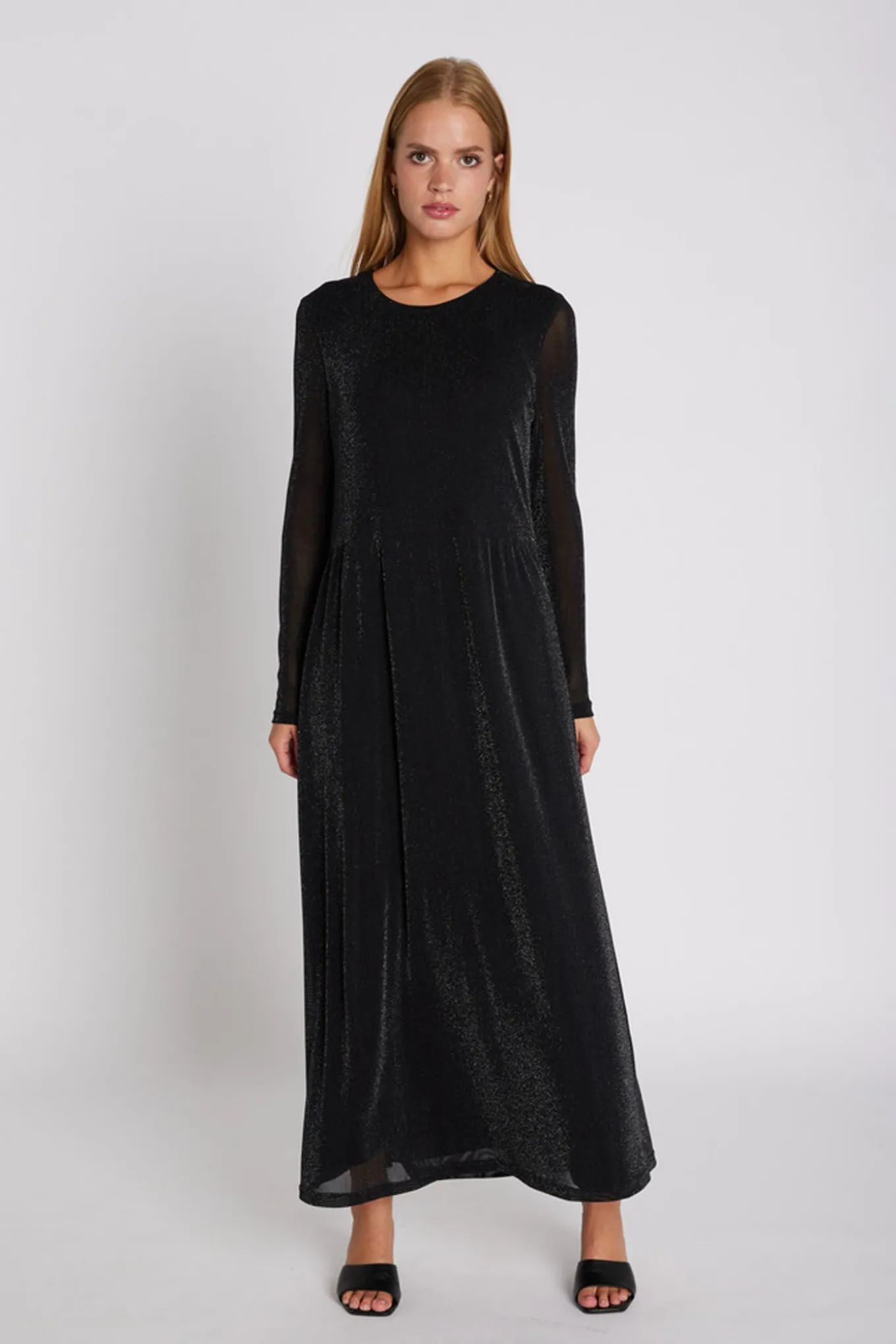 Elegant festkjole fra Rue de Femme med lange, let gennemsigtige ærmer og en rund halsudskæring. Det blanke materiale fanger lyset, mens den definerede talje med rynker skaber en feminin og flatterende silhuet.