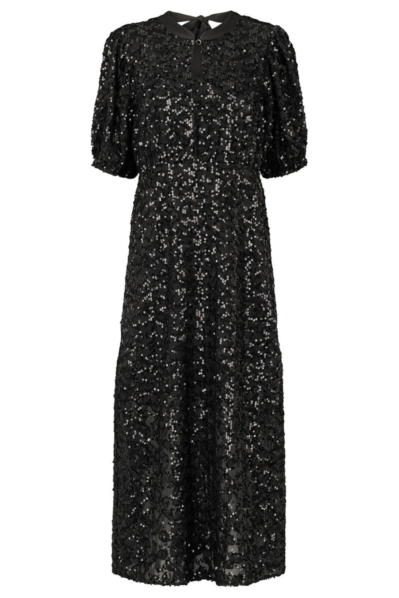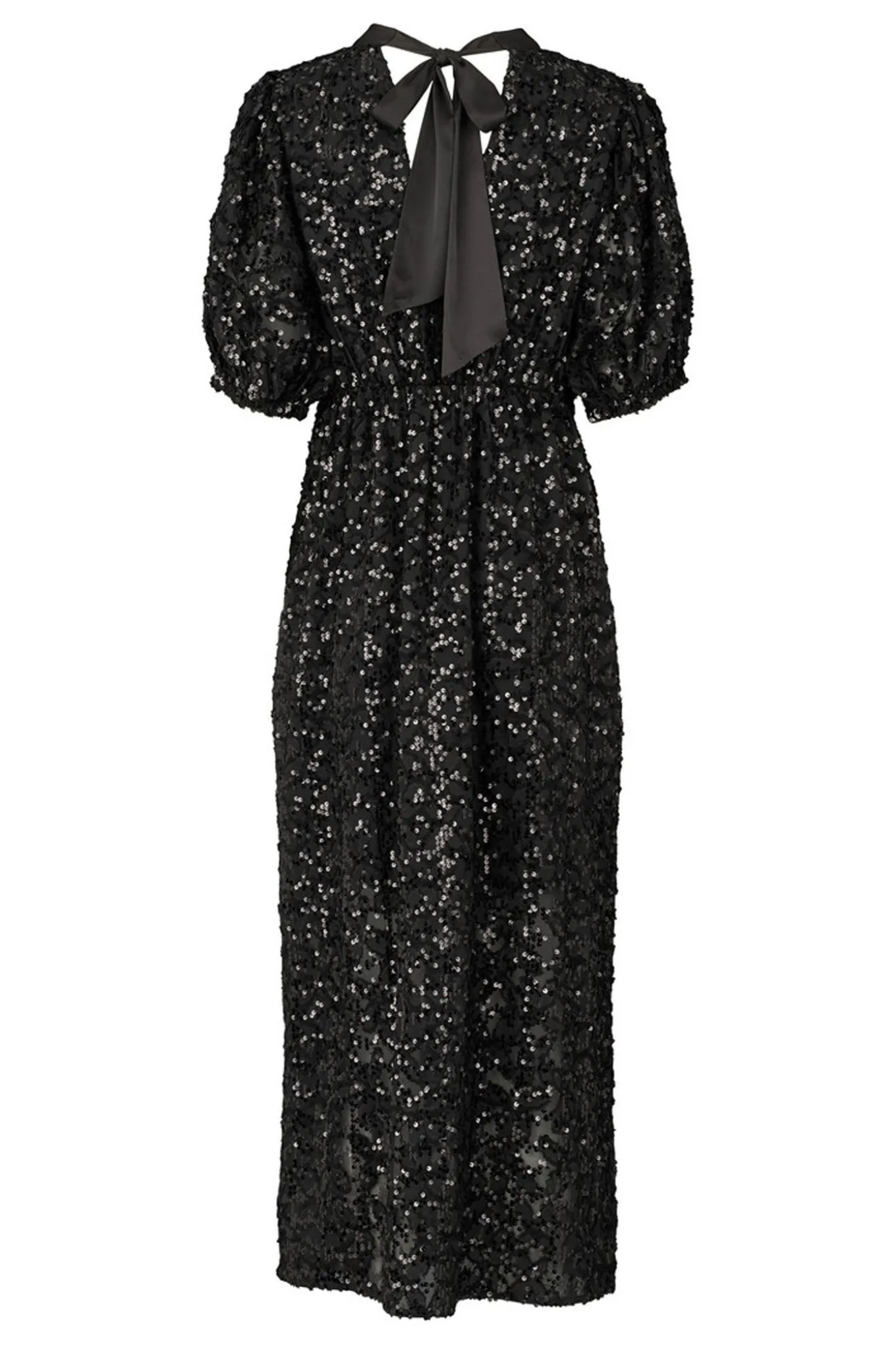 Lang festkjole med korte, voluminøse ærmer og en elegant åben ryg med bindebånd. Elastiske detaljer på manchetter og talje skaber en smuk, feminin form, der fremhæver silhuetten