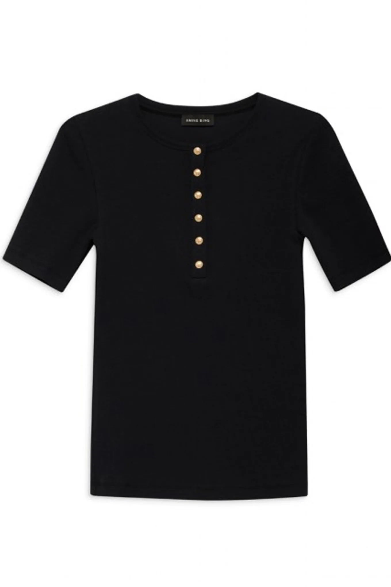 Fin tee fra Anine Bing med korte ærmer, rund hals og flotte guldknapper over brystet.