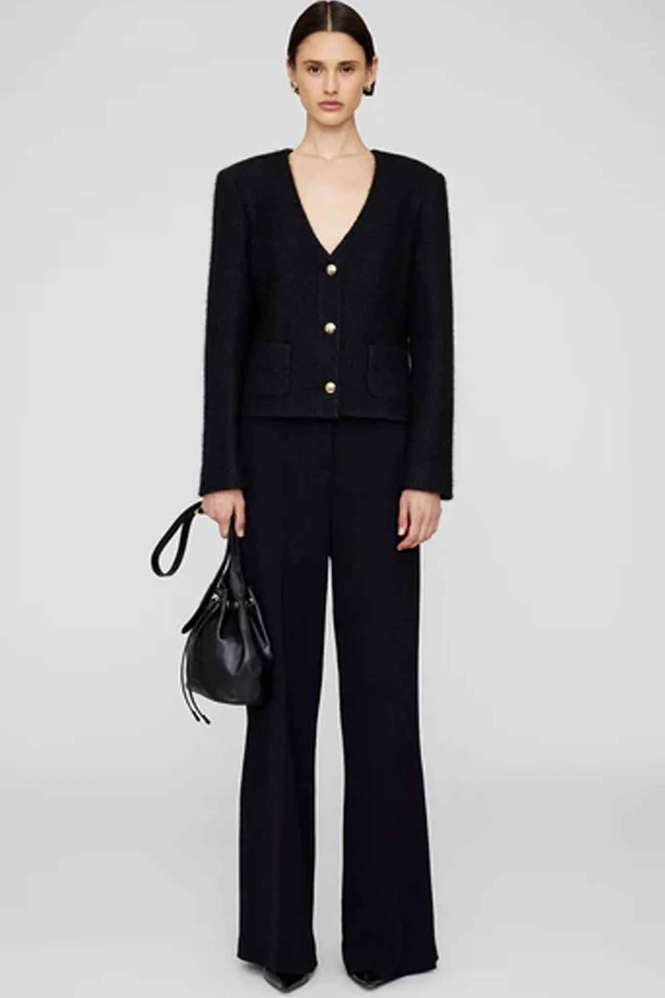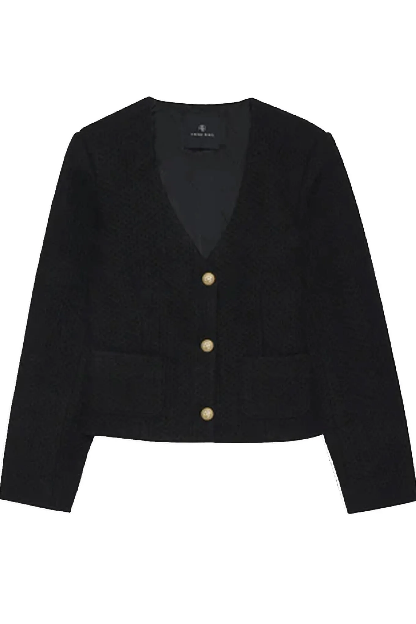 Flot jakke fra Anine Bing med ærmer, v-hals og små lommer i siderne. Jakken har også en flot diamant vævet kvalitet og lukkes i fronten med smukke guldknapper.