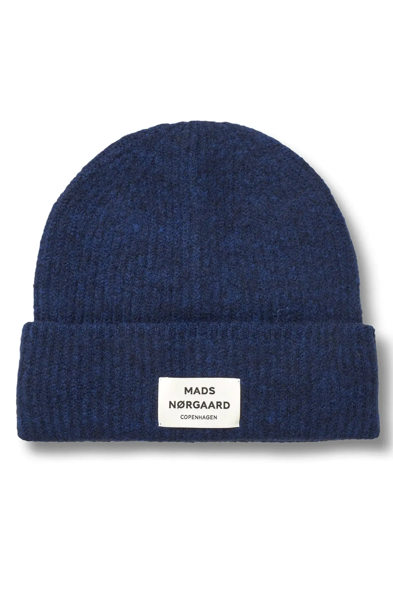 Blød, ribstrikket hue fra Mads Nørgaard med et fint opbuk og logomærke på fronten.