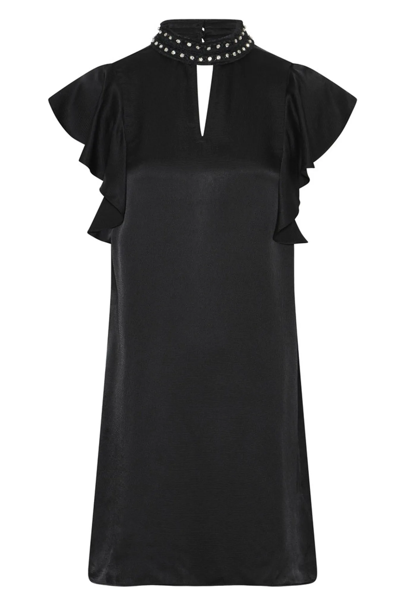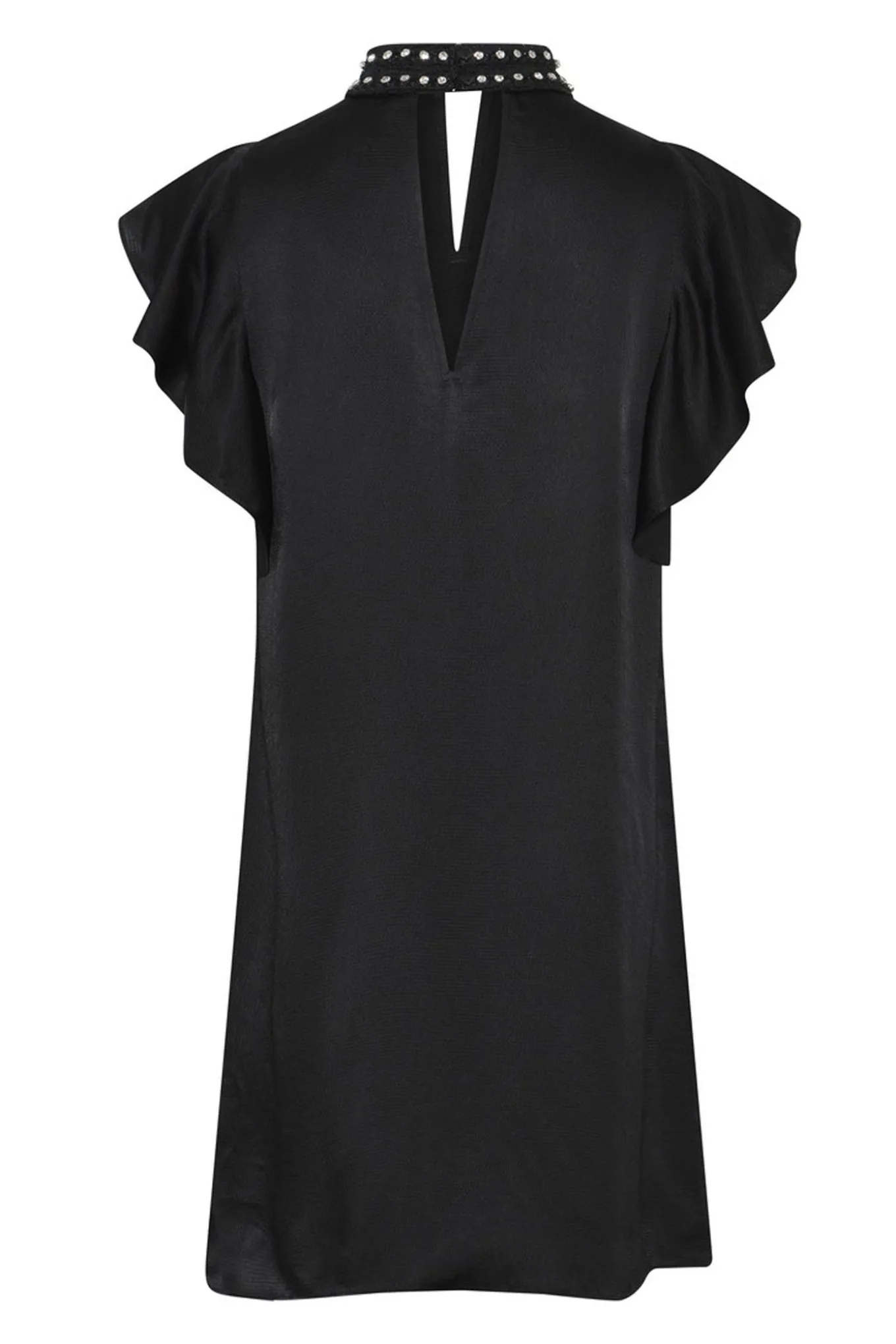 Elegant kjole med korte flæseærmer og en høj halsudskæring med dekorative sten. En tidløs silhuet med raffinerede detaljer.