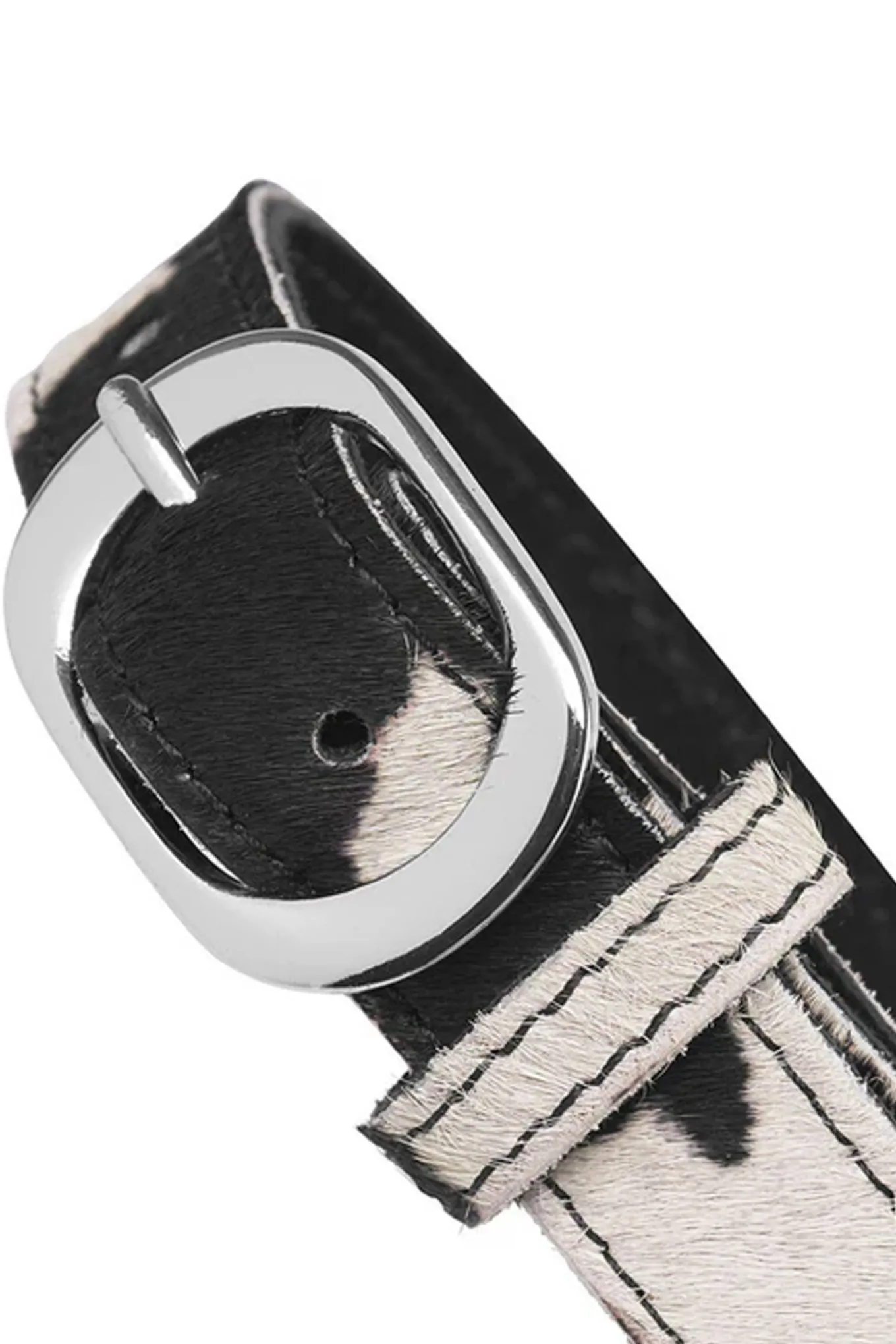 Få et råt og unikt udtryk med dette bælte fra DEPECHE. Det er lavet af 100% cow leather (hair on) i en elegant sort farve, der passer til enhver stil.