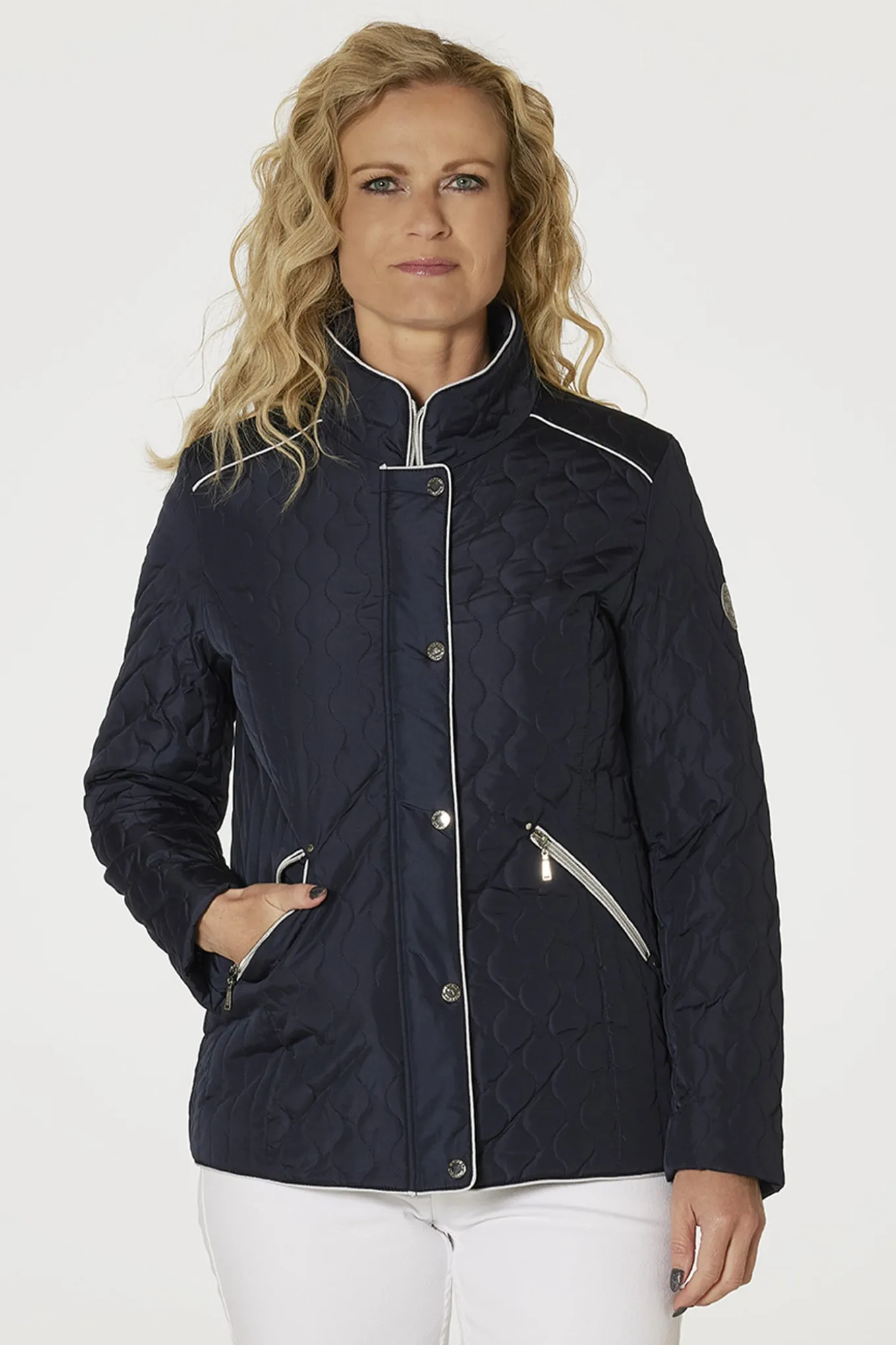 OBS! Fjernlager. Levering kan blive forlænget med 2-3 dage, hvis varen ikke findes i vores butik lige nu.Super flot quiltet jakke fra Danwear med lange ærmer, høj hals og et smart stribet foer.Jakken har også flotte kontrastfarvet kanter, skrå lynlåslommer og skjult lynlåslukning langs fronten bag et trykknappanel.