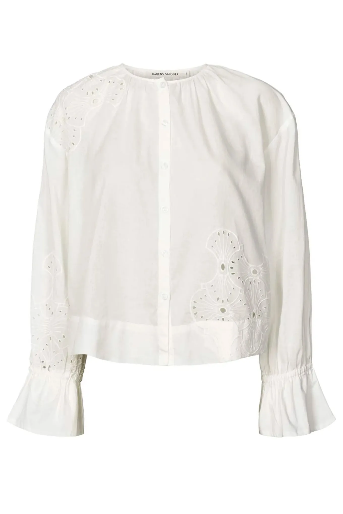 Oplev enkel elegance med denne hvide bluse fra Rabens Saloner. Lavet af let og behageligt materiale, er den perfekt til enhver lejlighed.