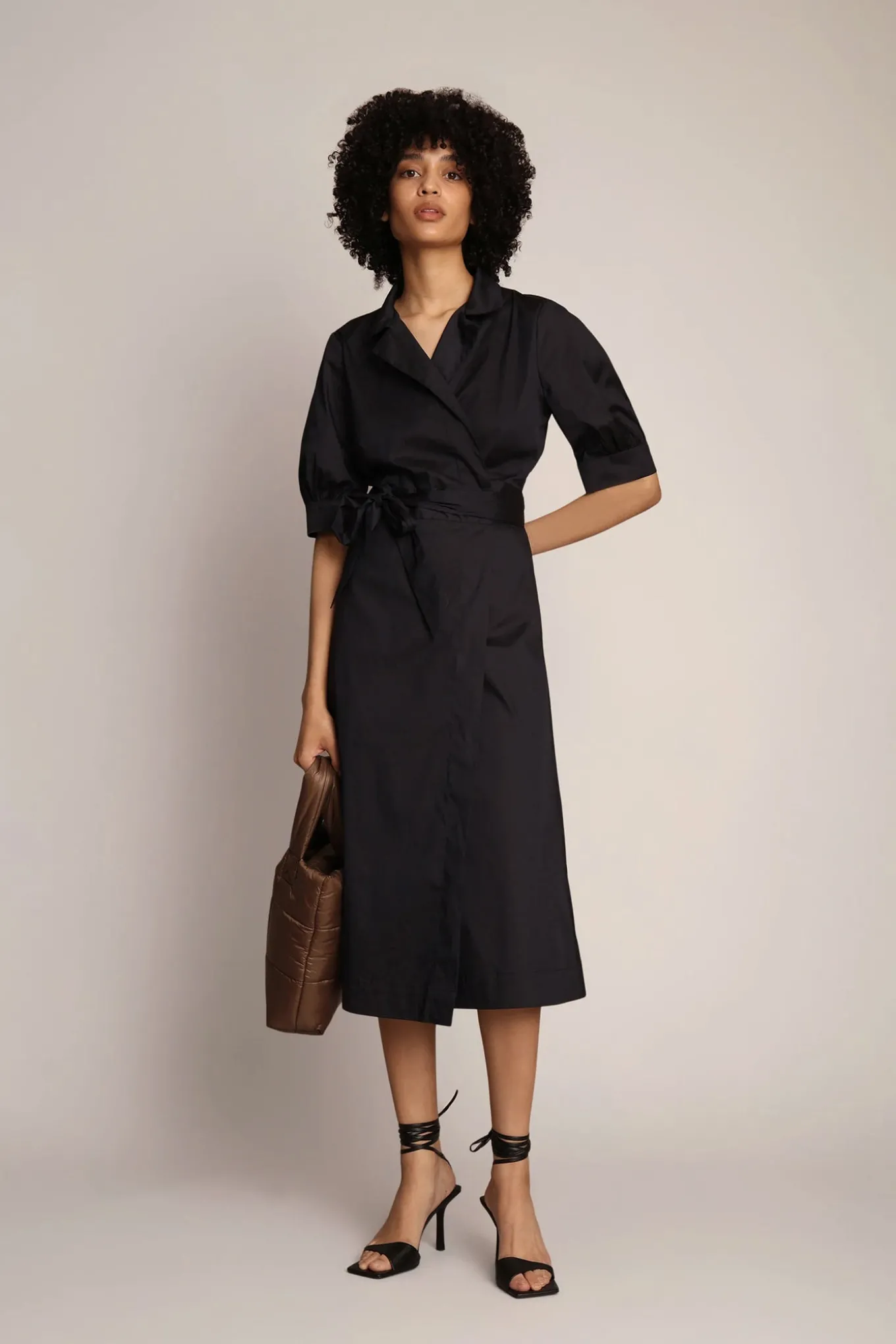 OBS! Fjernlager. Levering kan blive forlænget med 2-3 dage, hvis varen ikke findes i vores butik lige nu.Klassisk slå-om skjorte kjole fra Munthe, lavet i en økologisk bomulds blanding. Denne tætsiddende kjole har albue lange ærmer, med et lille puf og et elegant bindebånd i taljen.