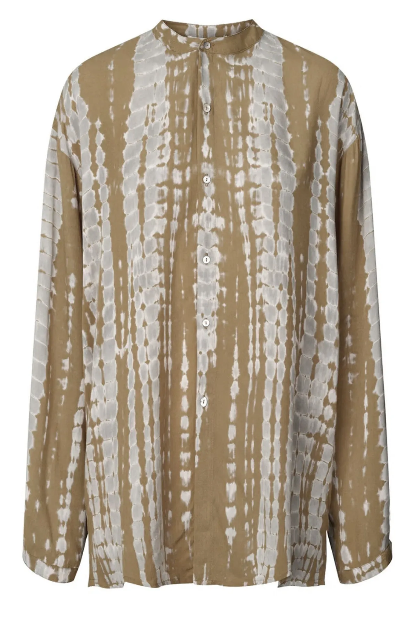 Blød og lækker oversize bluse fra Rabens Saloner med lange ærmer, kinakrave i halsen og knaplukning langs fronten.Blusen har også den dejligste kvalitet og et flot håndfarvet mønster.