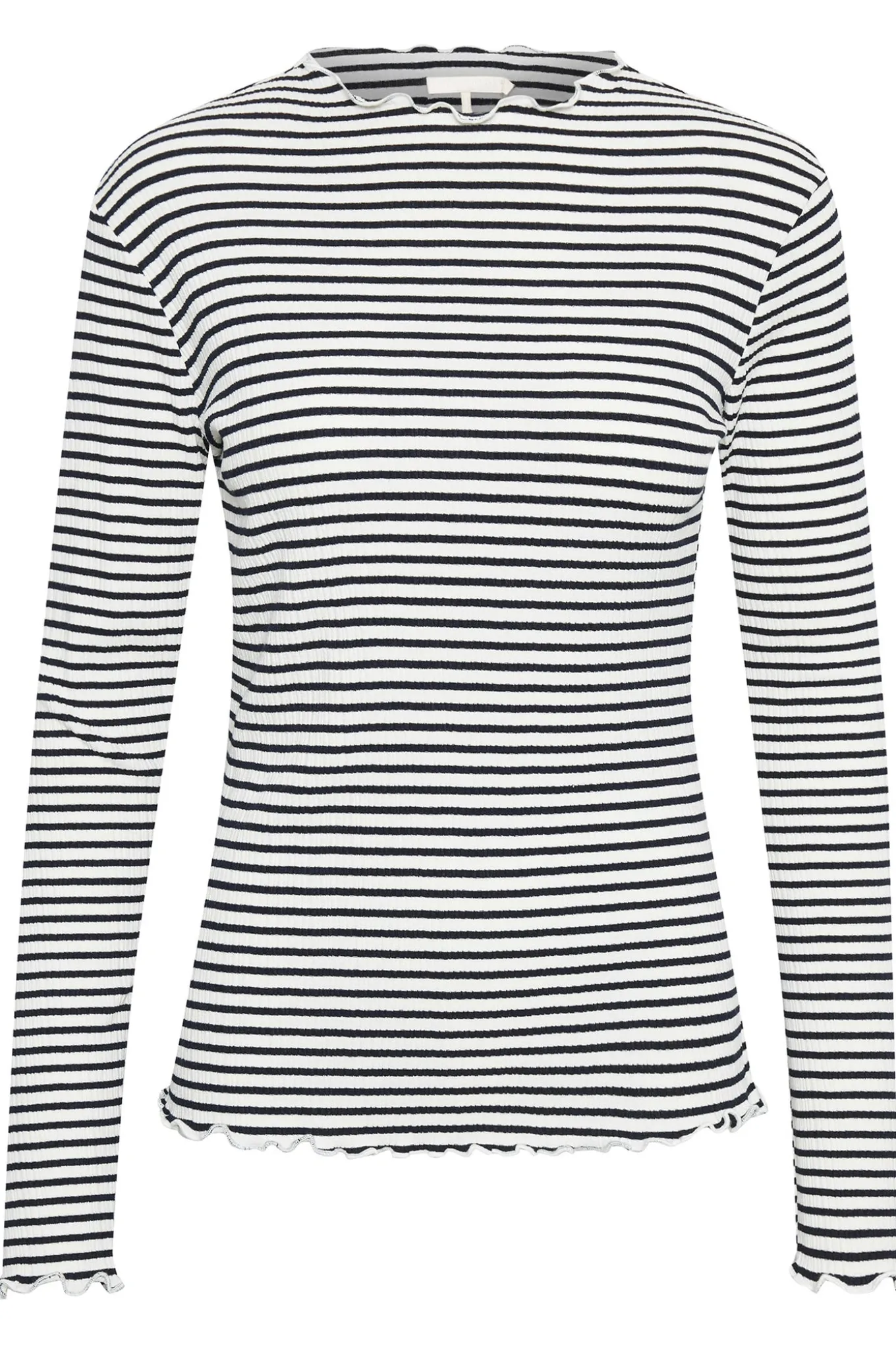 OBS! Fjernlager. Levering kan blive forlænget med 1-2 dage, hvis varen ikke findes i vores butik lige nu.Sød top fra Karen By Simonsen med lange ærmer og høj hals. Toppen har en fin stribet kvalitet og flotte rynkekanter.