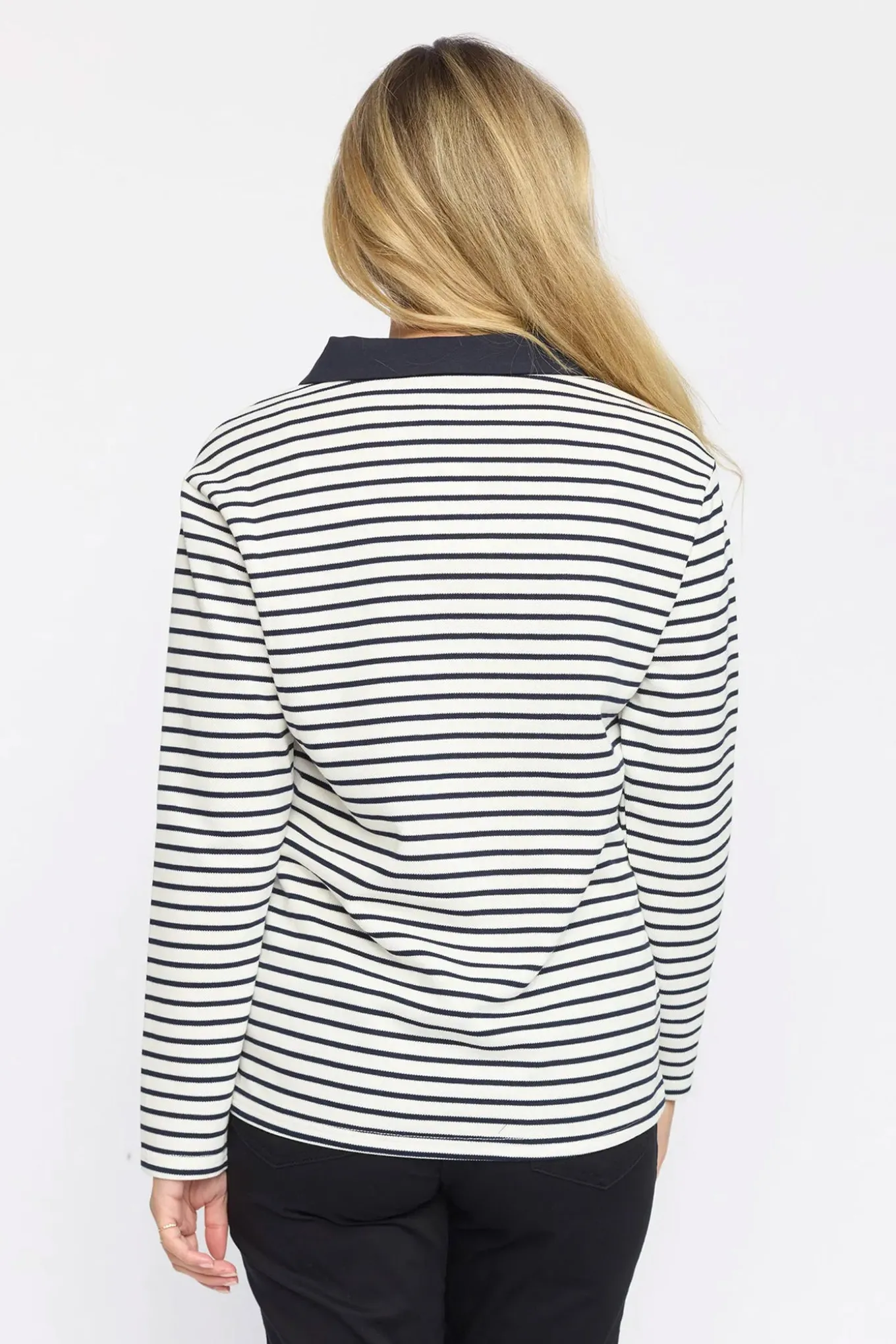 OBS! Fjernlager. Levering kan blive forlænget med 2-3 dage, hvis varen ikke findes i vores butik lige nu.Smart bluse fra 2-Biz med lange ærmer, en lille krave og v-udskæring i halsen samt et klassisk stribet print.