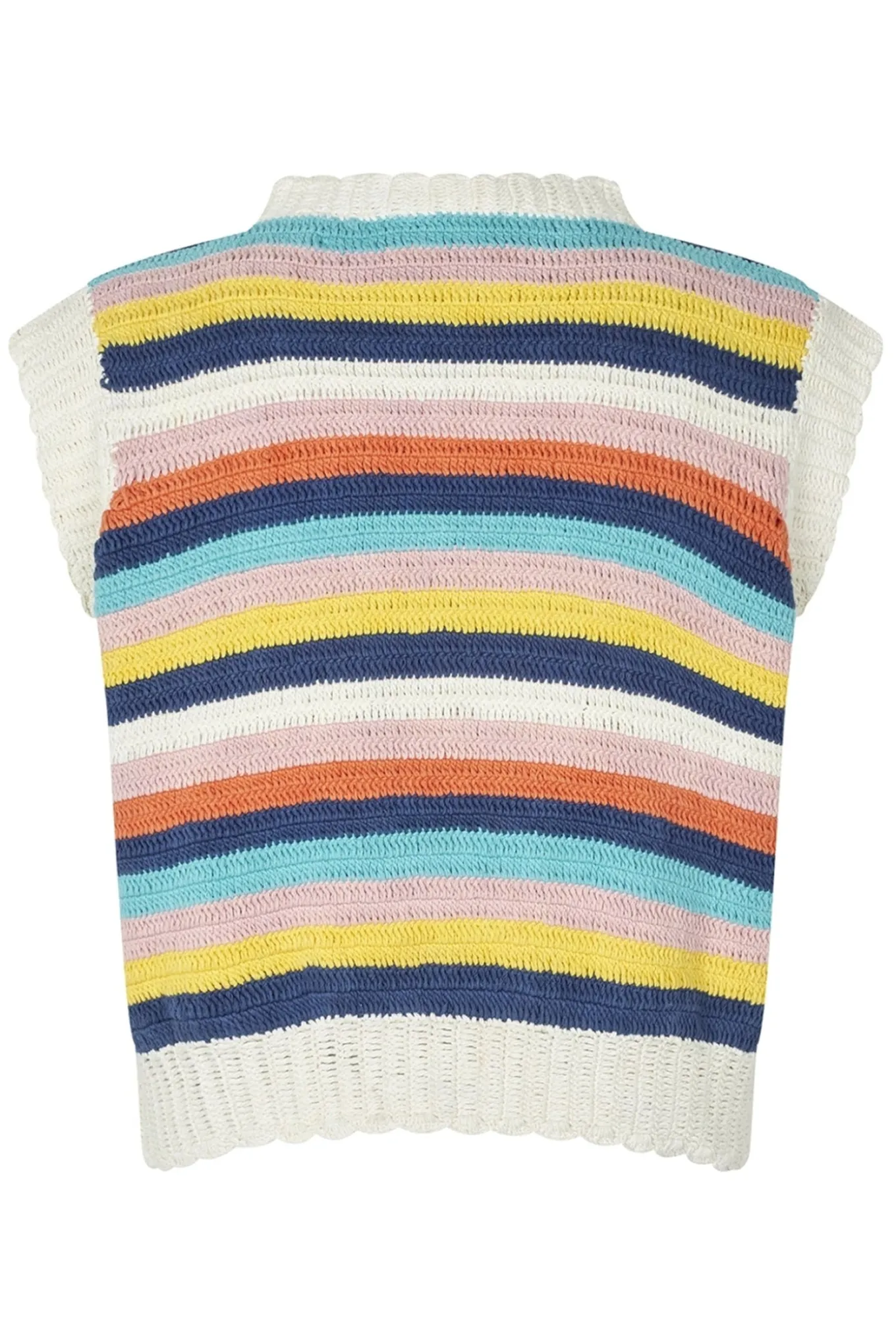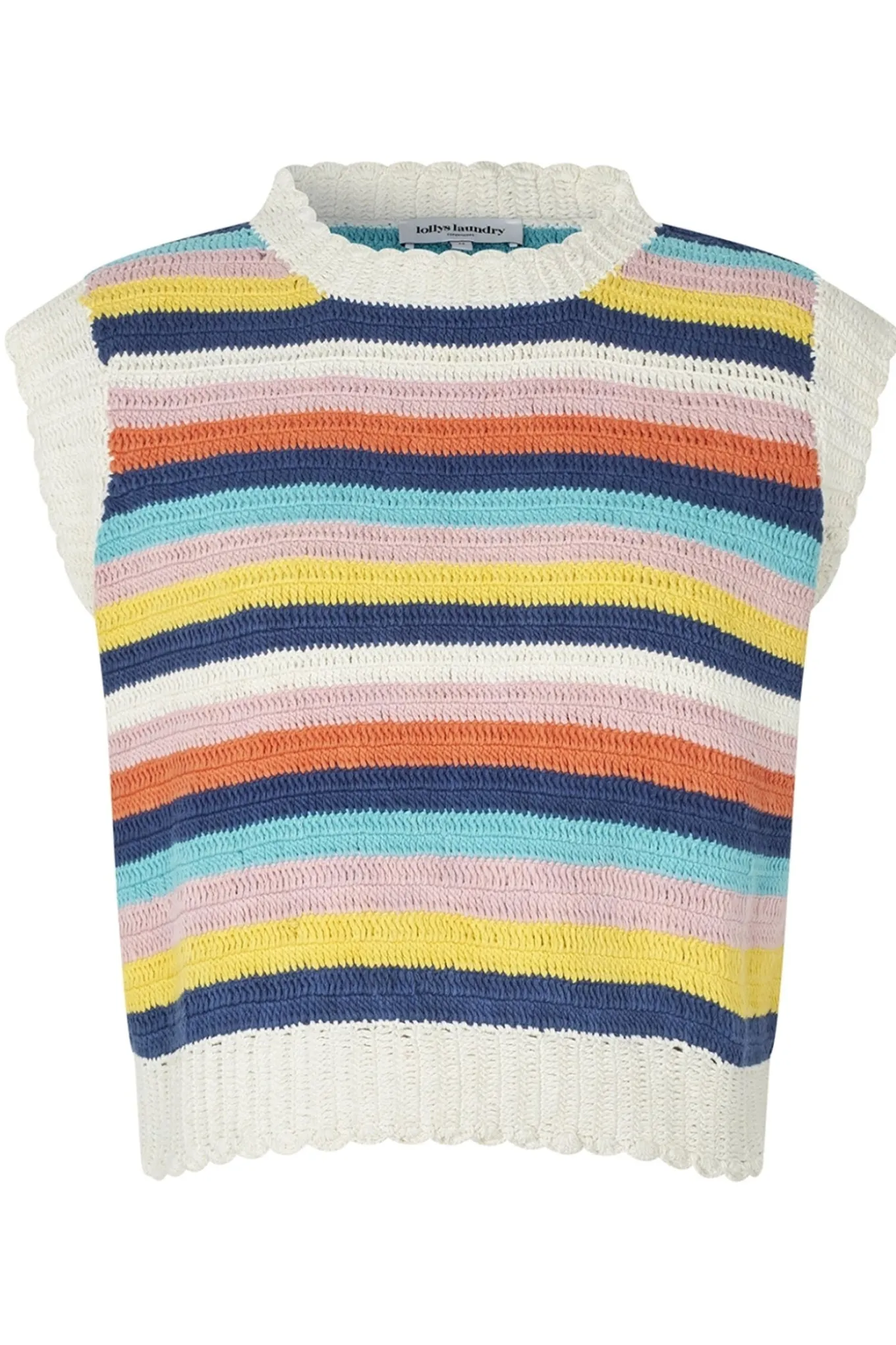 OBS! Fjernlager. Levering kan blive forlænget med 2-3 dage, hvis varen ikke findes i vores butik lige nu.Skøn strik fra Lollys Laundry med rund hals, små ærmer og en cropped længde. Strikken har også et skønt stribet mønster i fine farver og en afslappet silhuet.