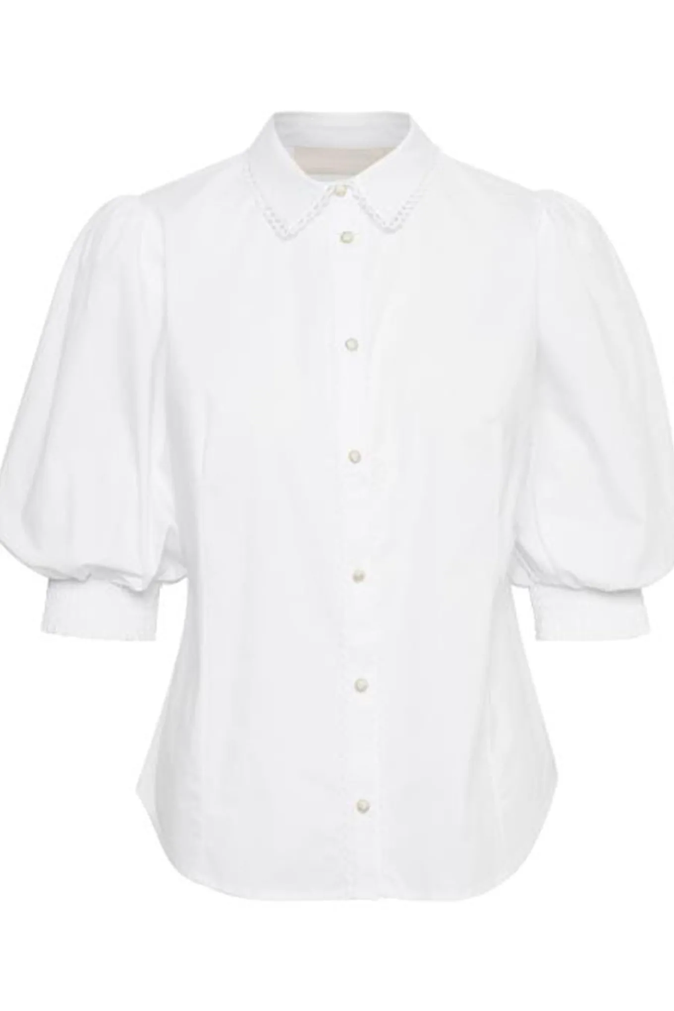Levering kan blive forlænget med 1-2 dage, hvis varen ikke findes i vores butik lige nu.Sød og feminin bluse fra Karen By Simonsen med korte pufærmer og en fin krave om halsen.