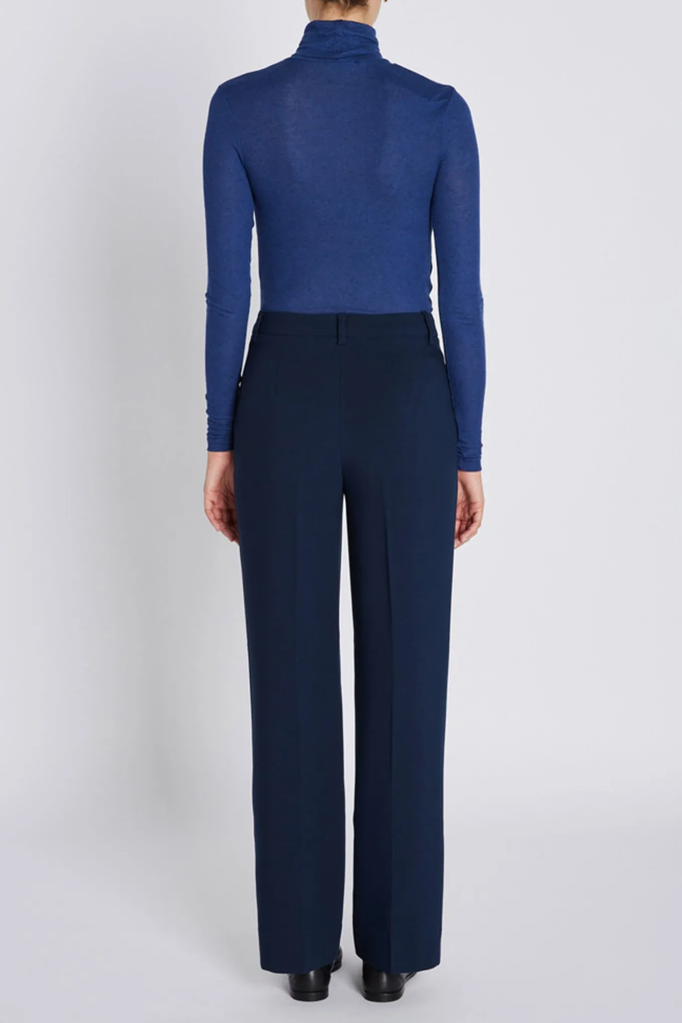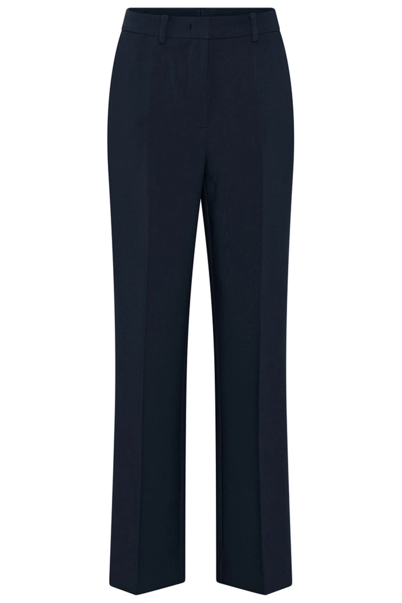Klassiske habitbukser med almindelig talje, bæltestropper, to sidelommer, lynlås og kroglukning og brede ben.