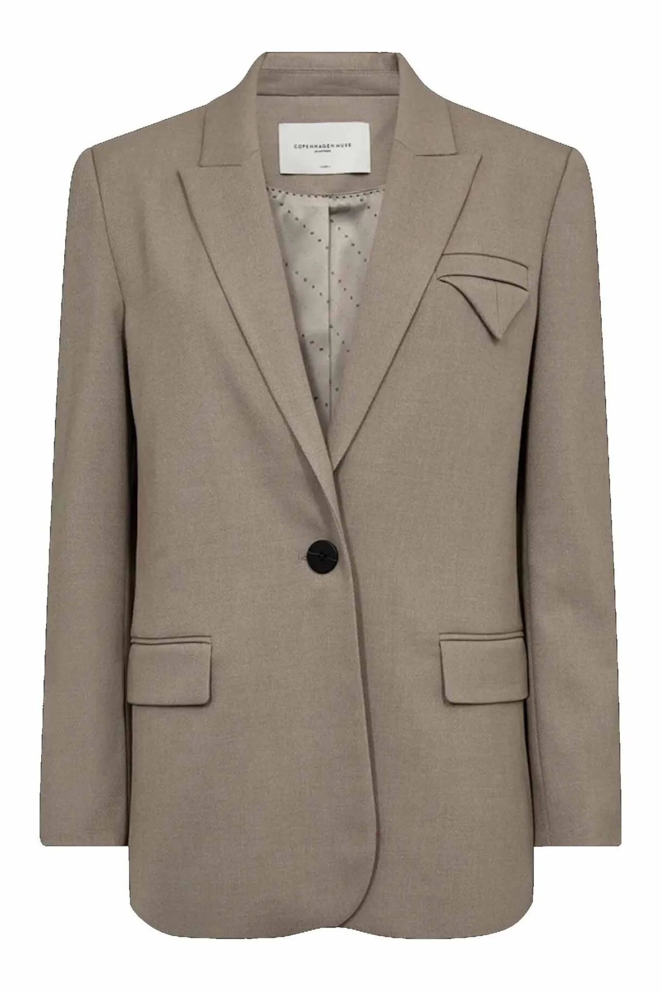 Flot og stilren blazer fra Copenhagen Muse med lange ærmer og en afslappet pasform. Blazeren har lommeflapper i fronten og lukkes også med en enkelt stor knap.
