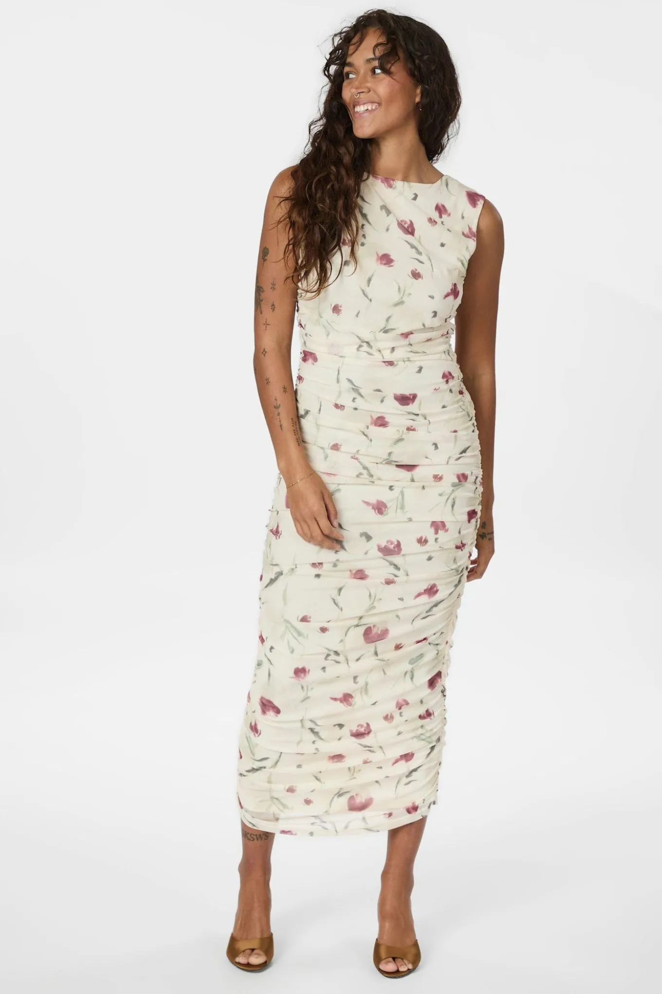 OBS! Fjernlager. Levering kan blive forlænget med 2-3 dage, hvis varen ikke findes i vores butik lige nu.Den smukkeste kjole fra Neo Noir med bådudskæring i halsen, en tætsiddende silhuet og flotte draperet effekter.Kjolen har også et romantisk print og en dejlig blød kvalitet.