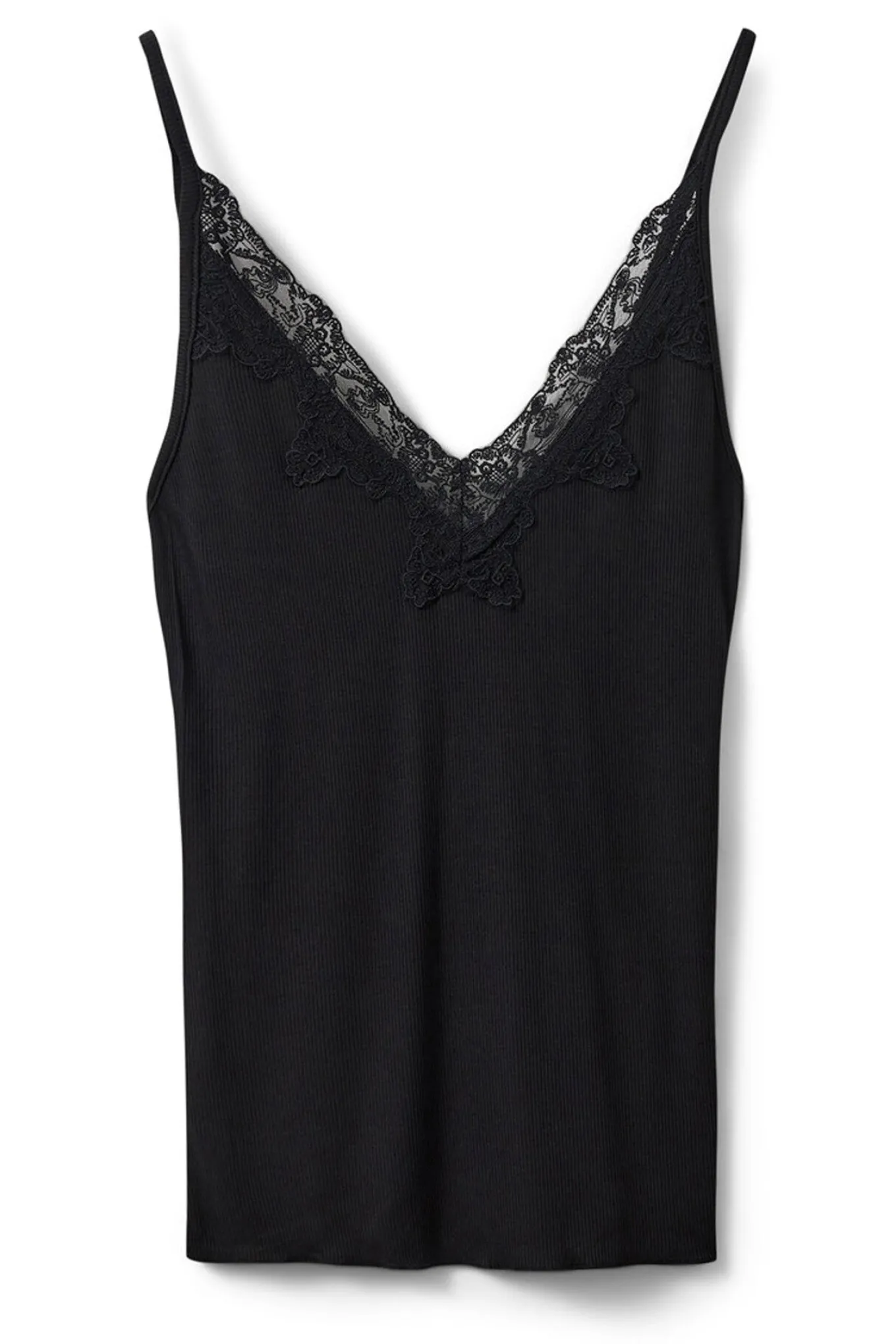 - OBS! Fjernlager. Levering kan blive forlænget med 2-3 dage, hvis varen ikke findes i vores butik lige nu.Sød basis top fra Sofie Schnoor med smalle skulderstropper og fine blondedetaljer.