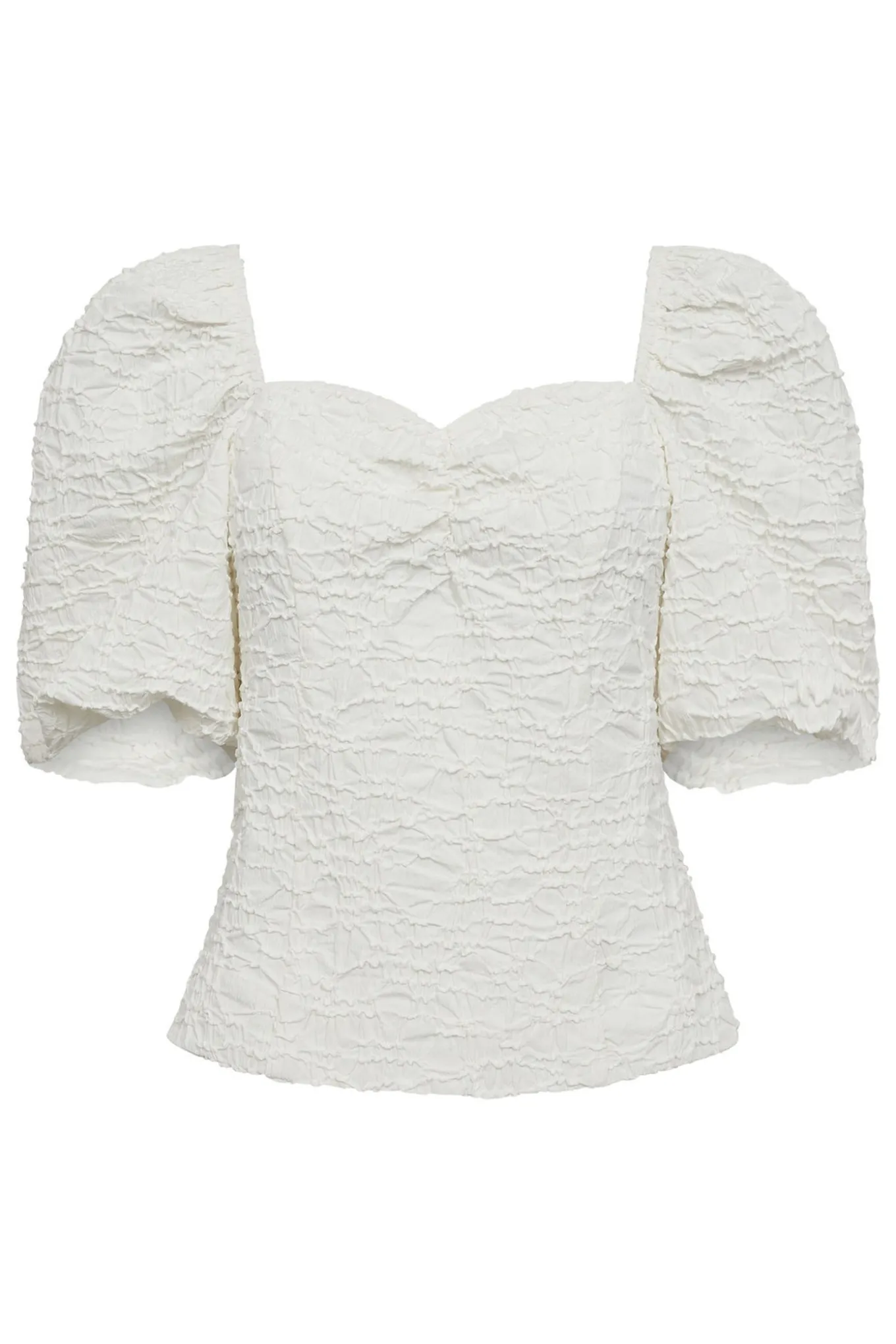 OBS! Fjernlager. Levering kan blive forlænget med 2-3 dage, hvis varen ikke findes i vores butik lige nu.Feminin top fra Haute L’Amitié med korte ærmer, en romantisk halsudskæring og en super flot struktureret kvalitet.