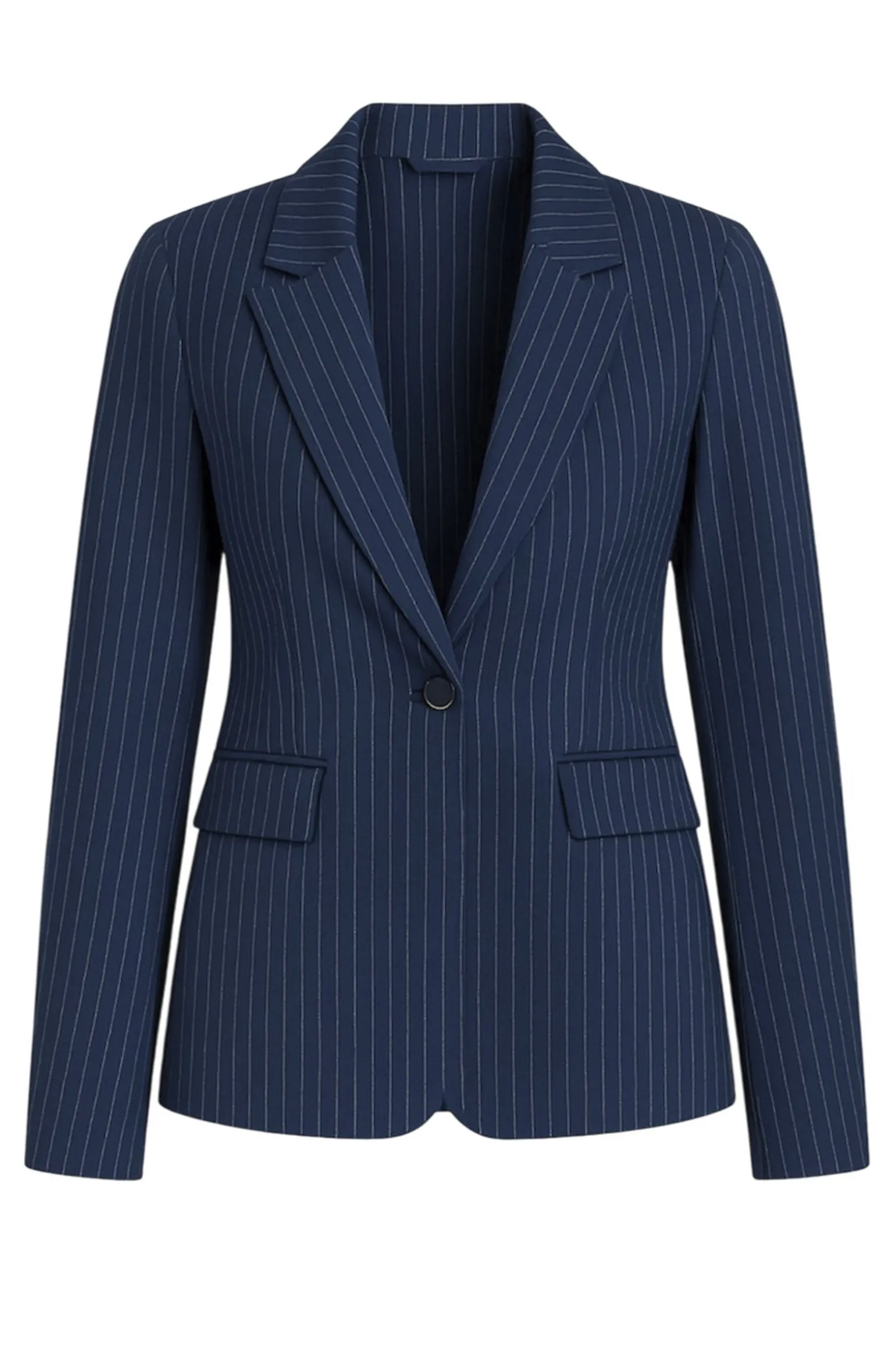 Klassisk blazer fra 2-Biz med lange ærmer, en fin smal krave i halsen og knaplukning foran. Blazeren har også et smart pinstripe print og lommeflapper i siderne.