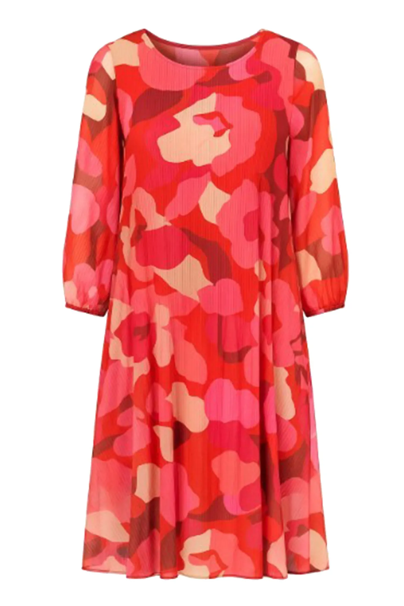OBS! Fjernlager. Levering kan blive forlænget med 2-3 dage, hvis varen ikke findes i vores butik lige nu.Flot kjole fra 2-Biz med ¾ let puffede ærmer, rund hals og et smukt abstrakt print med en fin plisseret kvalitet.