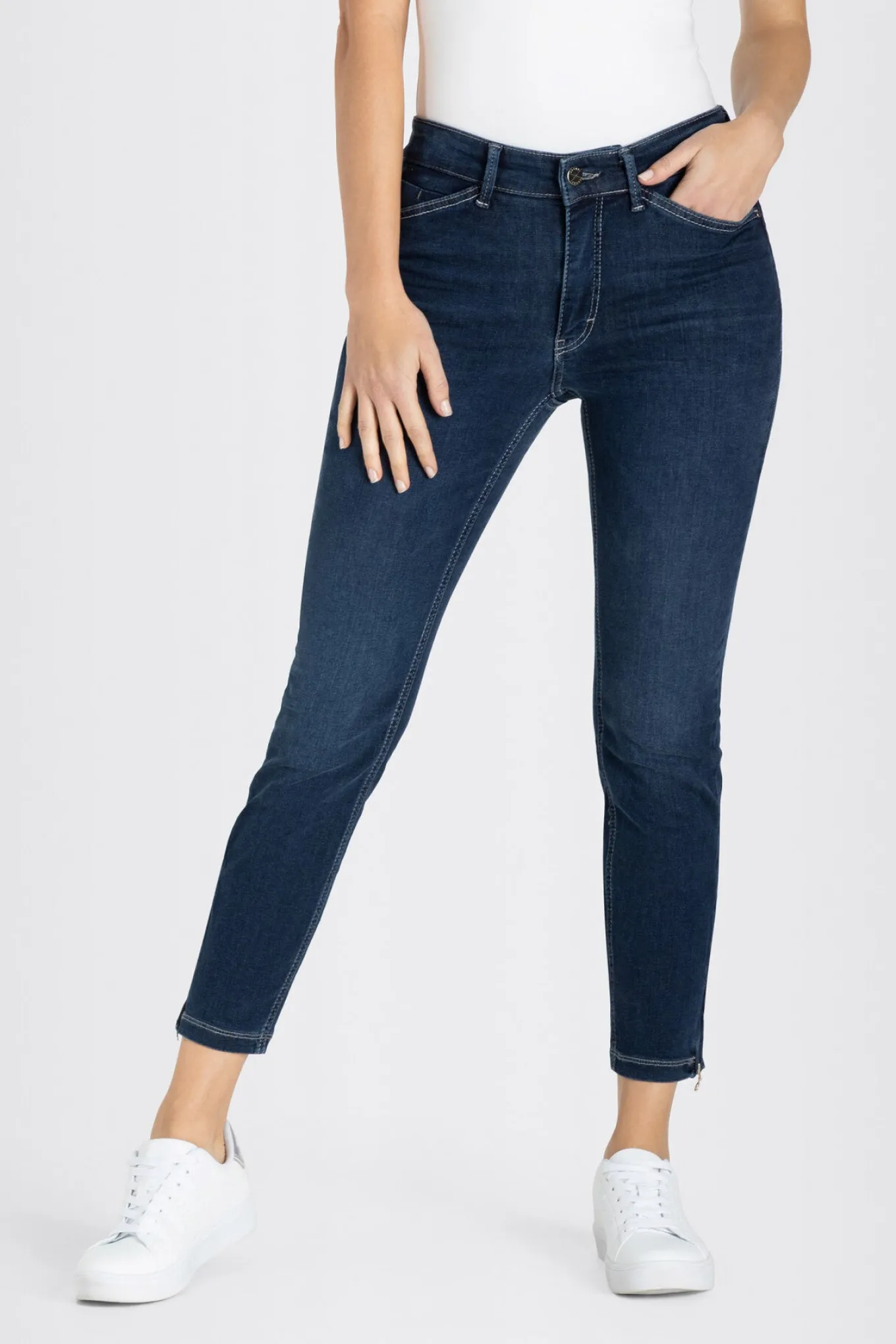 - Super smarte og enkle jeans fra Mac med en slim fit pasform, et straight-leg snit og cropped længde. Bukserne har også en cool lille lynlåsdetalje i bunden, bæltestropper og klassiske lommer.
