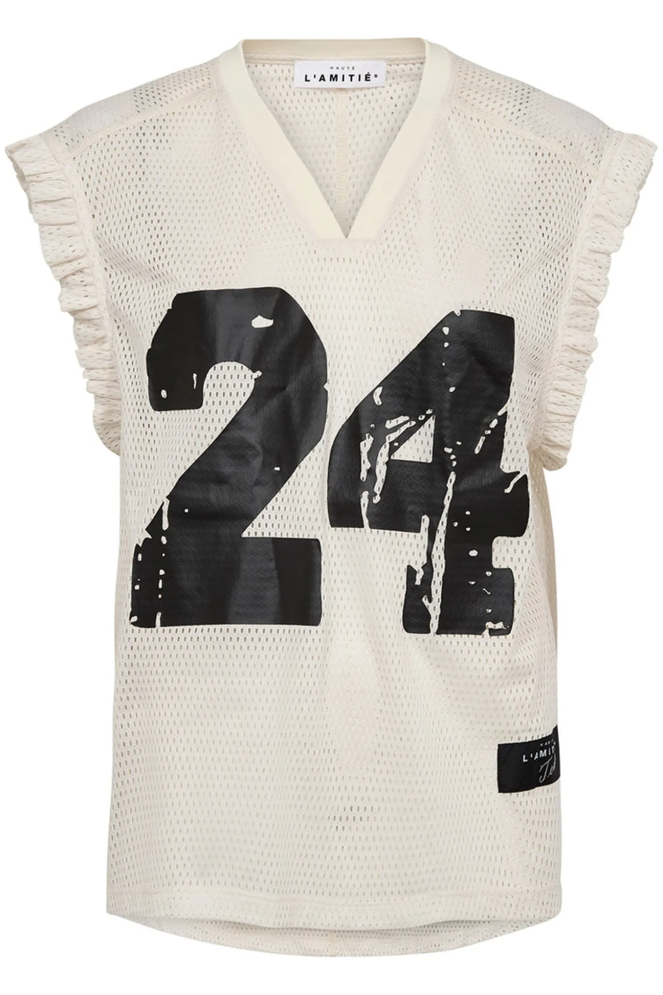 OBS! Fjernlager. Levering kan blive forlænget med 2-3 dage, hvis varen ikke findes i vores butik lige nu.Cool, sporty og feminin tee fra Haute L’Amitié med v-udskæring i halsen, smalle flæsedetaljer og et smart tryk på fronten.