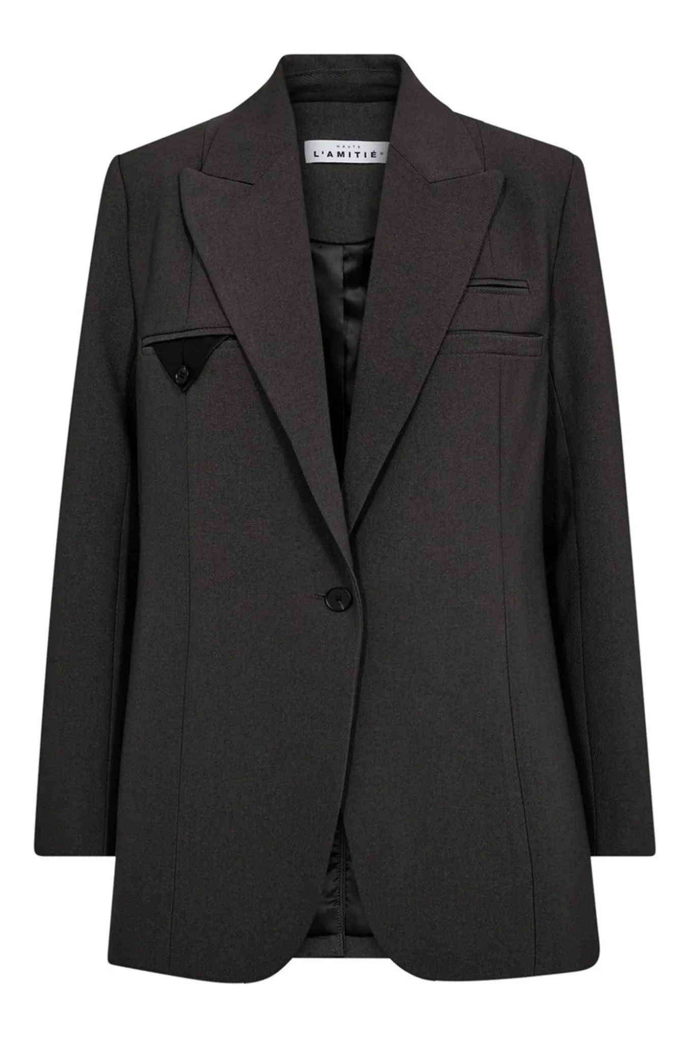 Super lækker blazer fra Haute L’Amitié med lange ærmer, en klassisk krave i halsen og en enkelt knap til at lukke med foran.