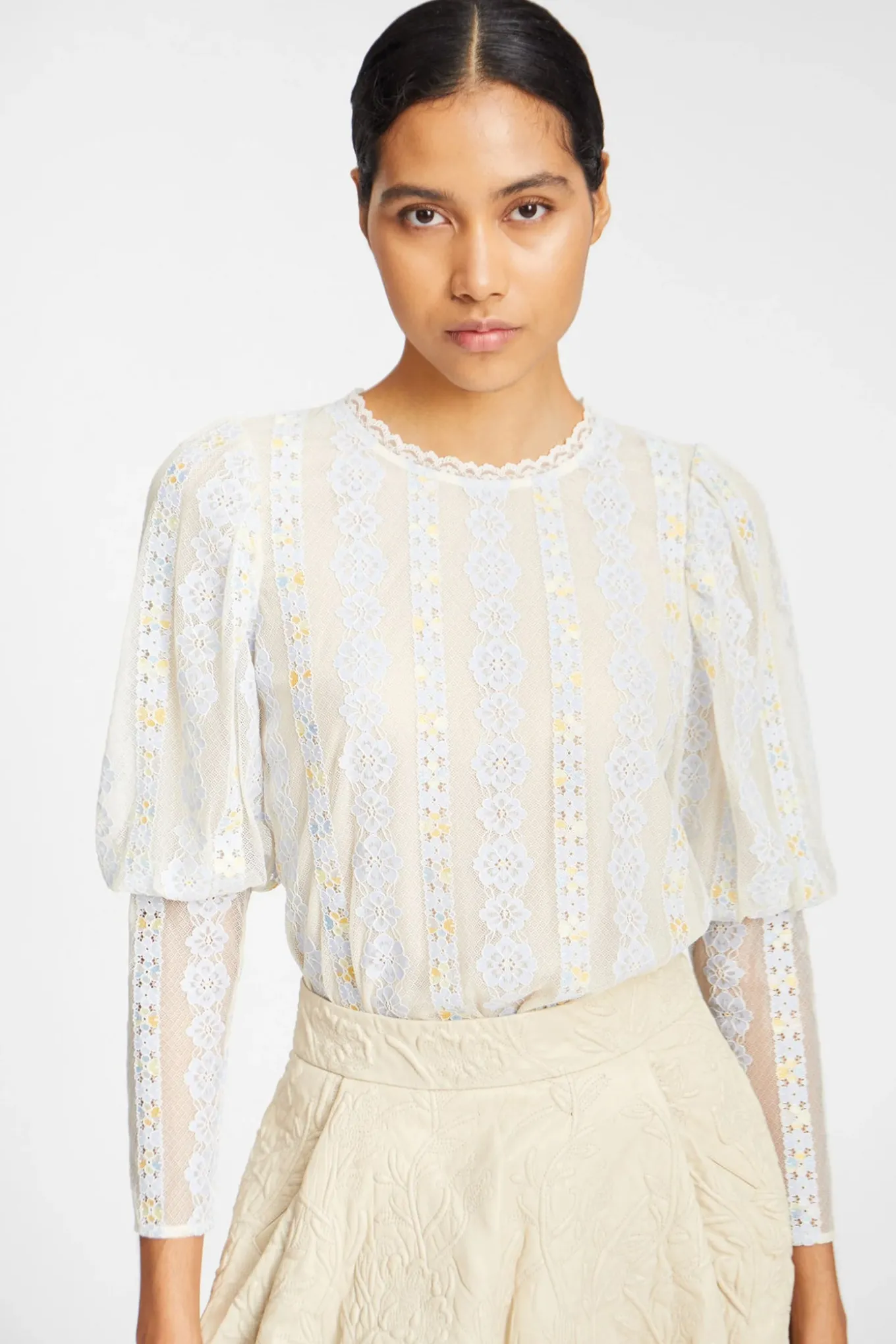 OBS! Fjernlager. Levering kan blive forlænget med 2-3 dage, hvis varen ikke findes i vores butik lige nu.Bluse fra Munthe med en smuk all-over blomster blonde. Blusen har lange ærmer med en elegant puf effekt fra skulder til albue, og lukkes med en knap lukning på ryggen.