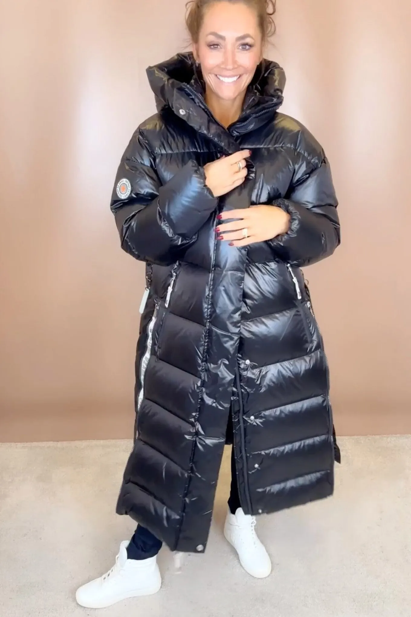 En luksuriøs dunjakke fra Caya med skjult to-vejs lynlås der lukker jakken. Høj krave med hætte, der holder på varmen. To sidelommer og en inderlomme med lynlåslukning. Jakken har også slidser med lynlås der giver mulighed for at åbne op i siderne. Derudover har jakken seler på indersiden, der holder den på plads.