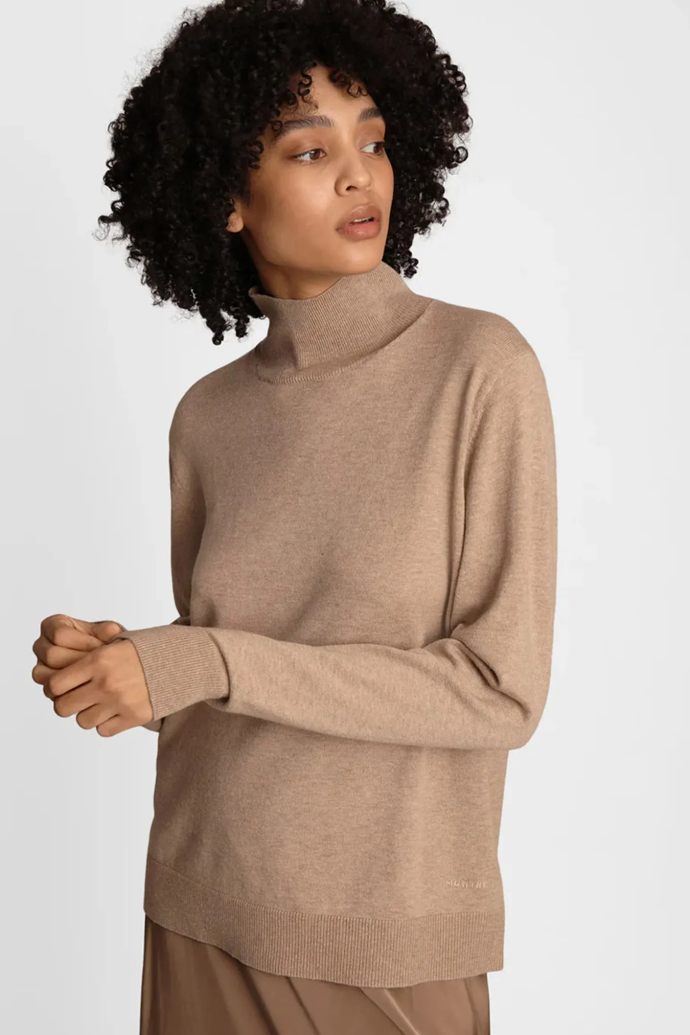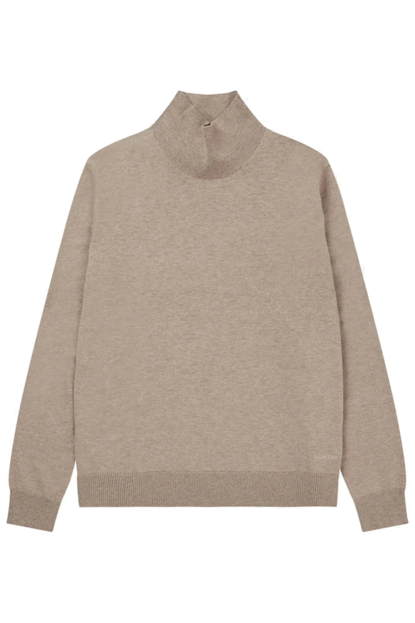 Klassisk let strik lavet af en blød merinould blanding. Denne strik har lange ærmer, høj hals og en elegant rib langs kanterne.