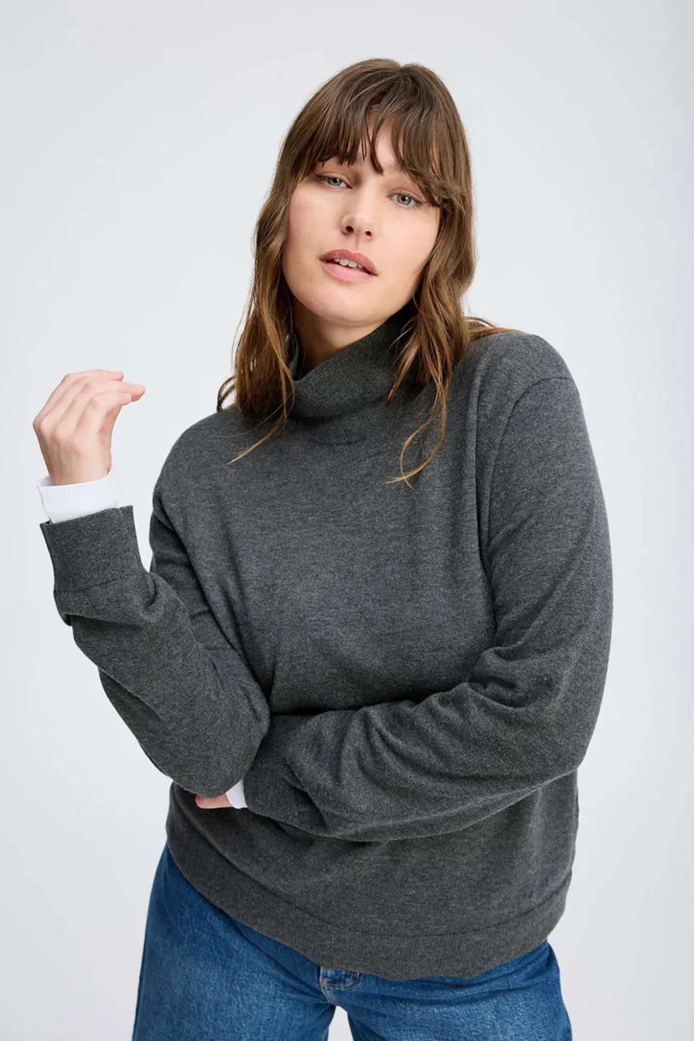 Få et sofistikeret look med denne lækre striktrøje fra Munthe. Den er lavet af en blanding af ekstra fin merinould og bomuld og har en dyb kulgrå farve. Perfekt til både hverdag og fest.