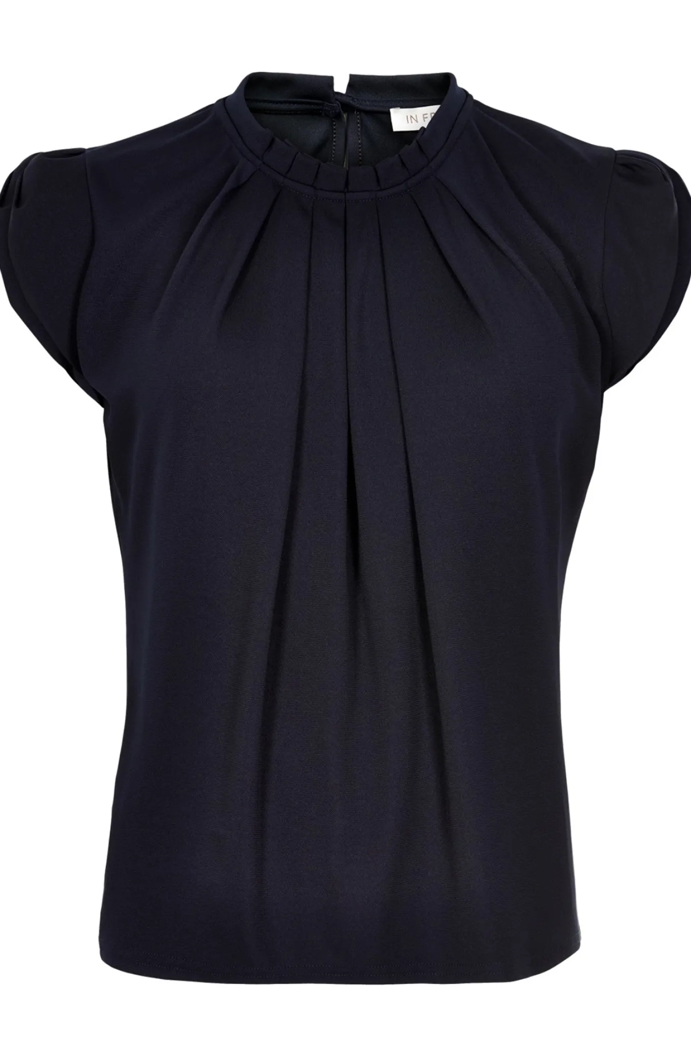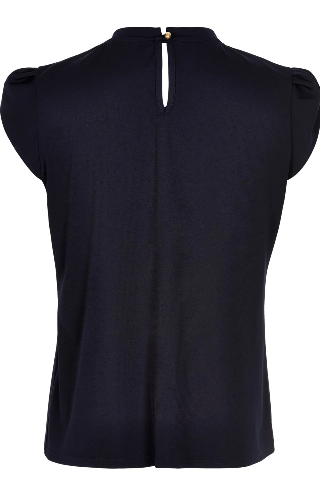 Levering kan blive forlænget med 1-2 dage, hvis varen ikke findes i vores butik lige nu.Smuk top In Front. Denne smukke top har rund hals der har fine flæse detaljer, der lukkes med knap i nakken, over en fin dråbeformet udskæring. Brug den sammen med en mønstret nederdel.