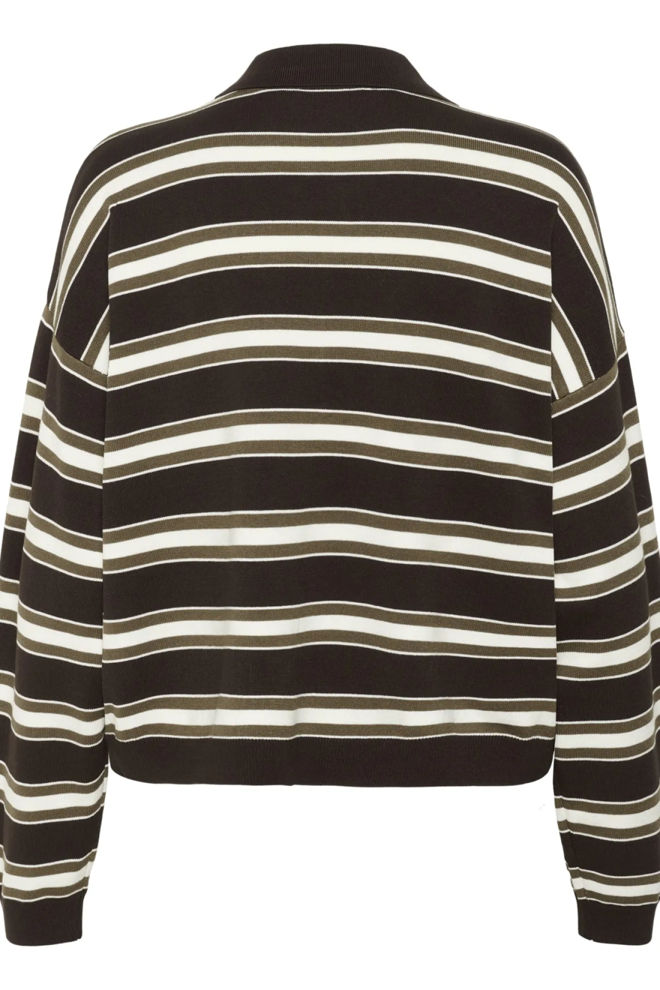 OBS! Fjernlager. Levering kan blive forlænget med 2-3 dage, hvis varen ikke findes i vores butik lige nu.Smart polo strik fra Gestuz med lange ærmer, en lille krave i halsen og et kort knappanel over brystet.Strikken har også et fint stribet mønster og et lille broderet logo på brystet.