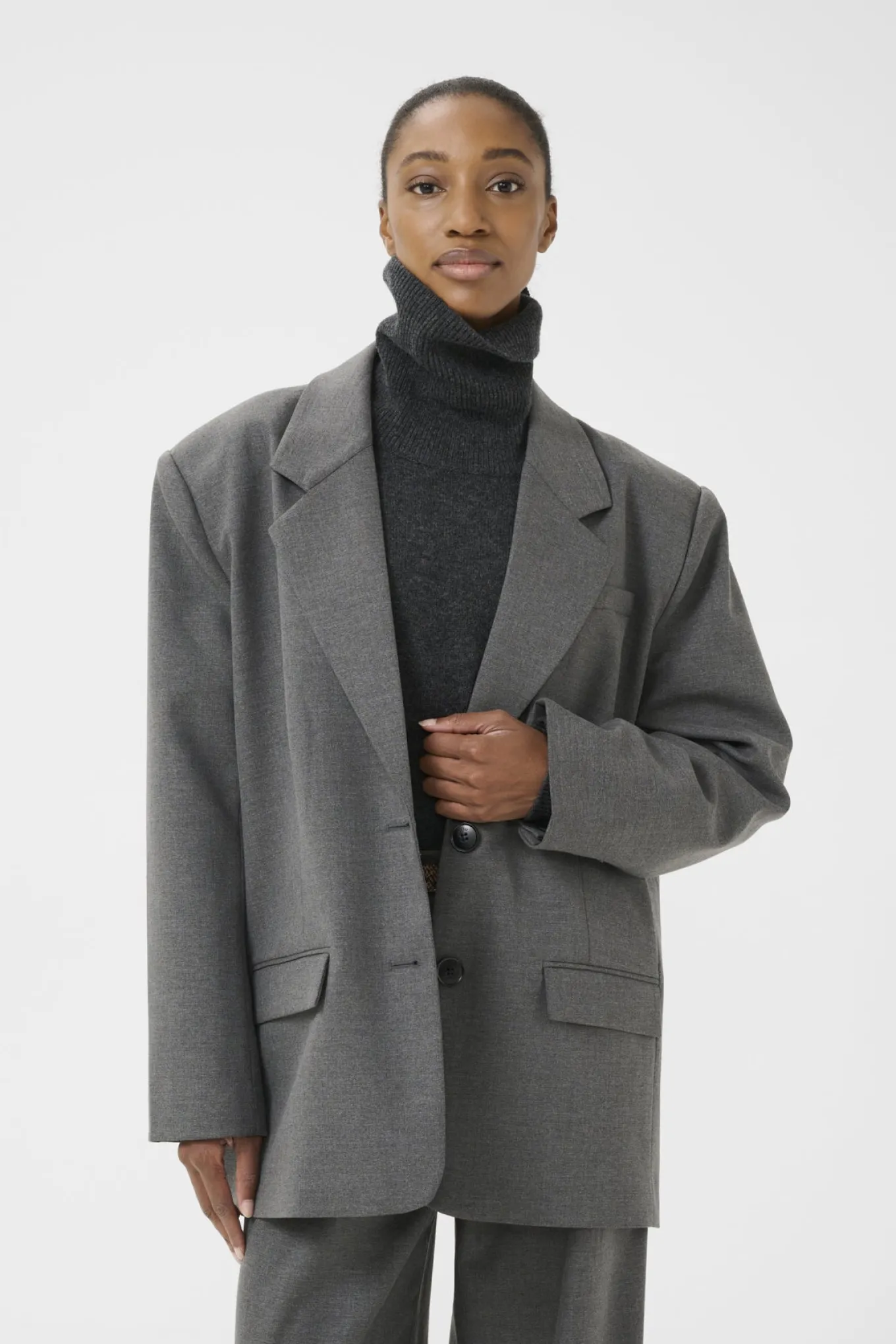 OBS! Fjernlager. Levering kan blive forlænget med 2-3 dage, hvis varen ikke findes i vores butik lige nu.Flot oversized Gestuz blazer med lange ærmer, v-udskæring med en smal krave og lommeflapper i siderne.Blazeren lukkes med knapper langs fronten.