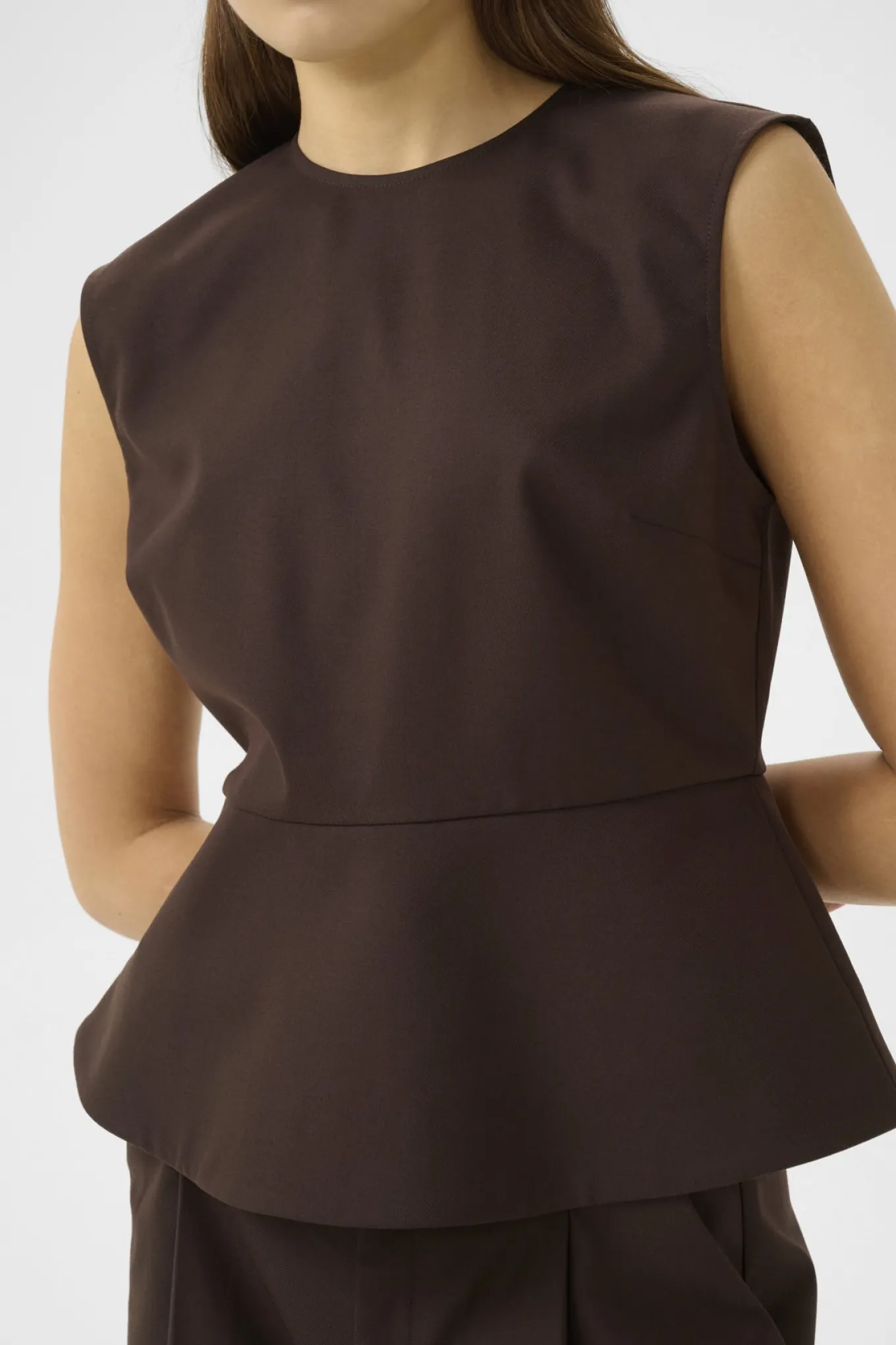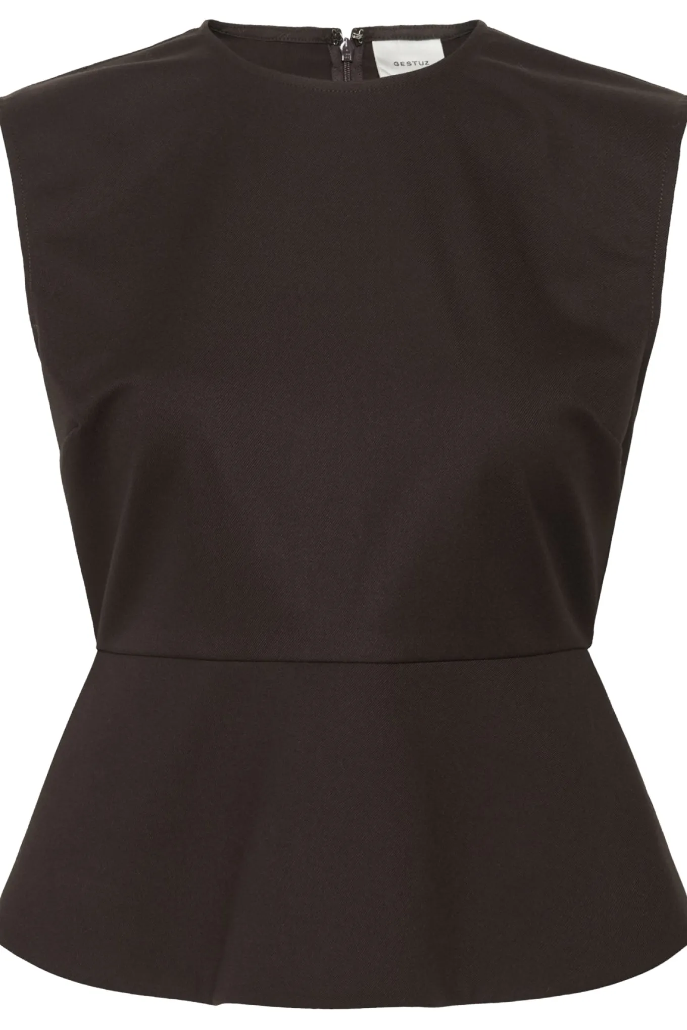 OBS! Fjernlager. Levering kan blive forlænget med 2-3 dage, hvis varen ikke findes i vores butik lige nu.Elegant figursyet top fra Gestuz med et feminint peplum snit, rund hals og lynlåslukning i nakken.