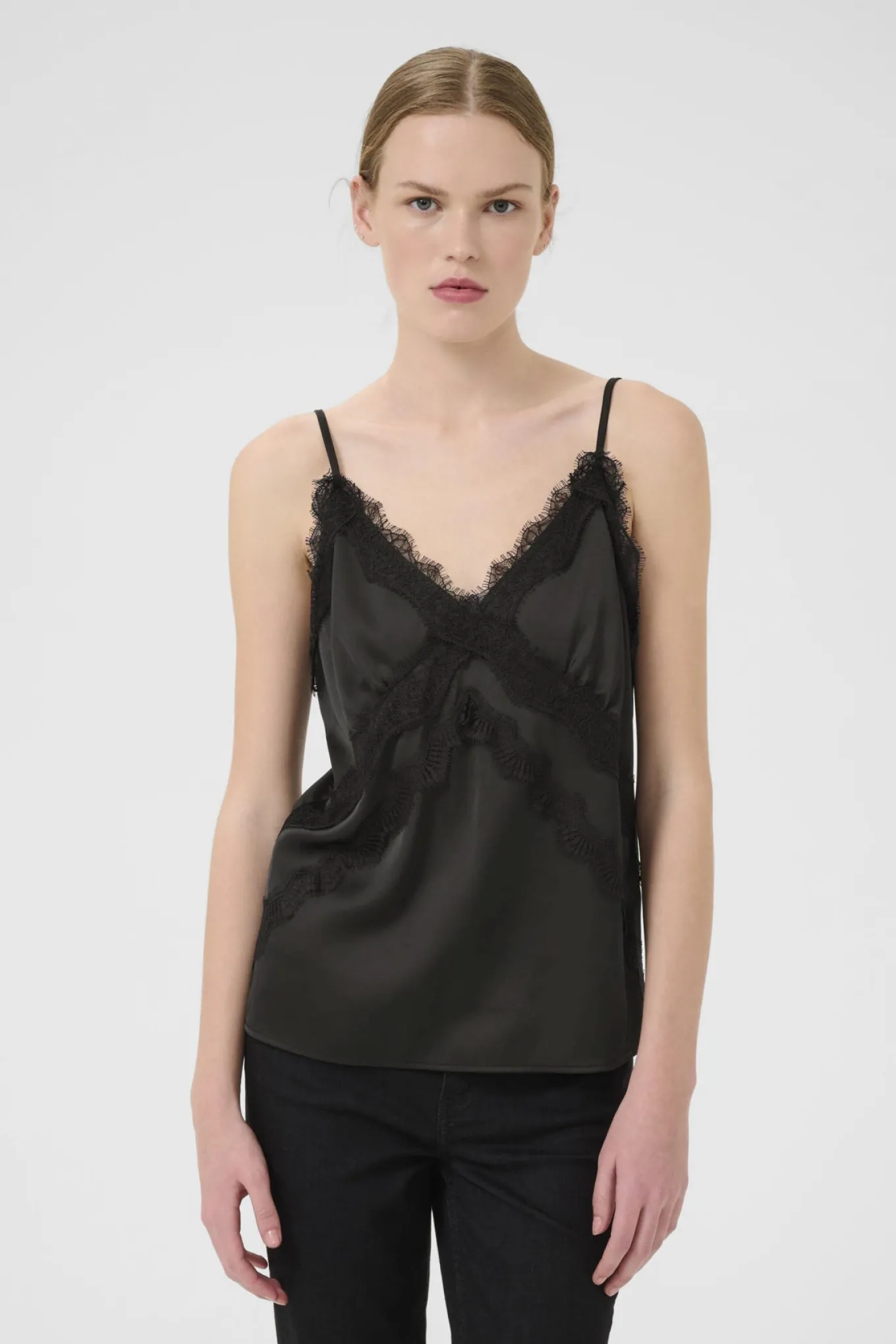 OBS! Fjernlager. Levering kan blive forlænget med 2-3 dage, hvis varen ikke findes i vores butik lige nu.Smuk blondetop fra Gestuz med smalle justerbare skulderstropper og fine detaljer.