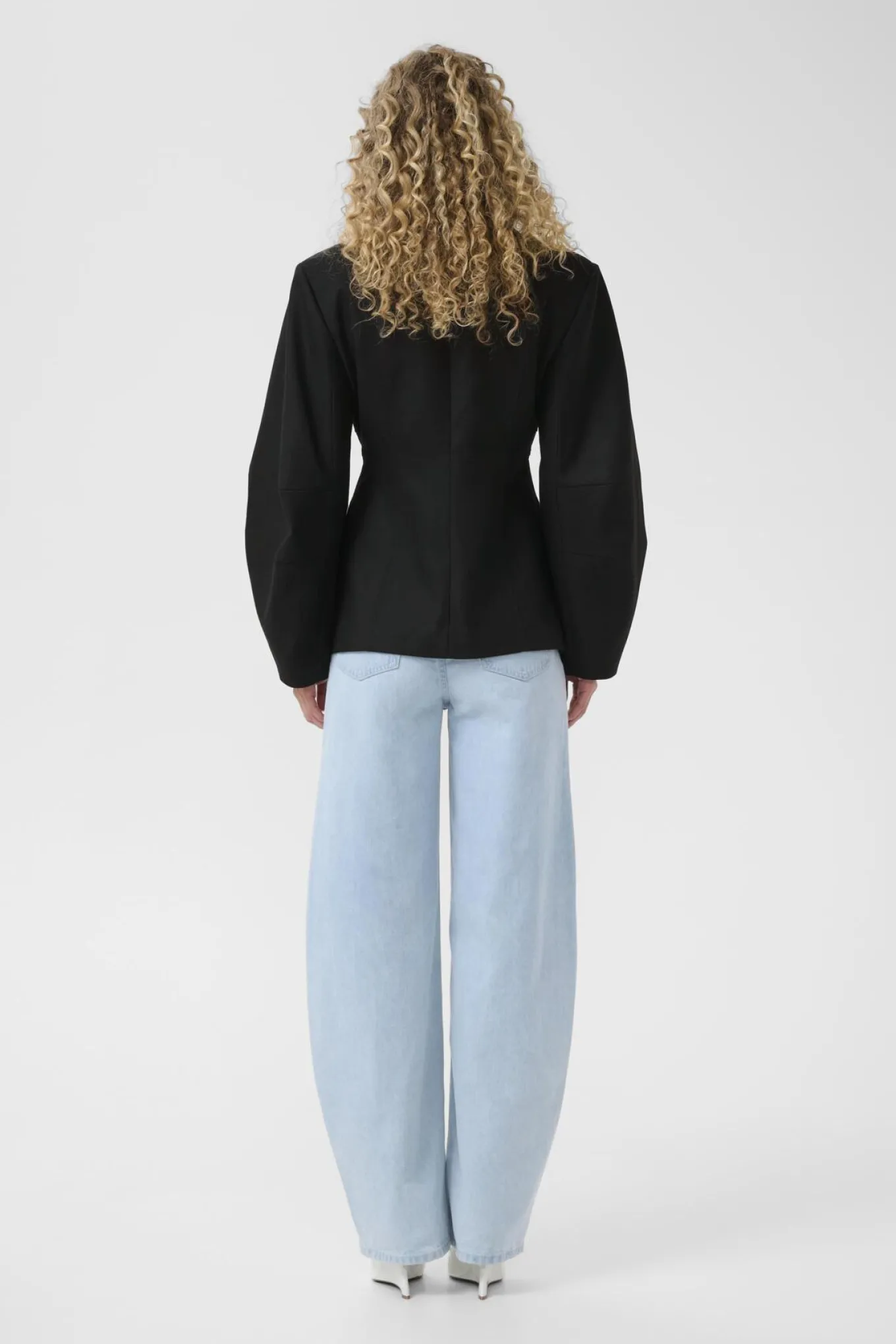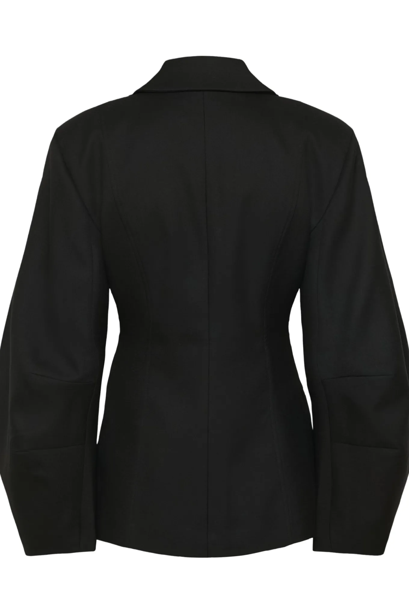 Denne elegante blazer fra Gestuz i sort er lavet af 68% genanvendt polyester og 30% viskose. Perfekt til enhver lejlighed og et bæredygtigt valg fra Gestuz.