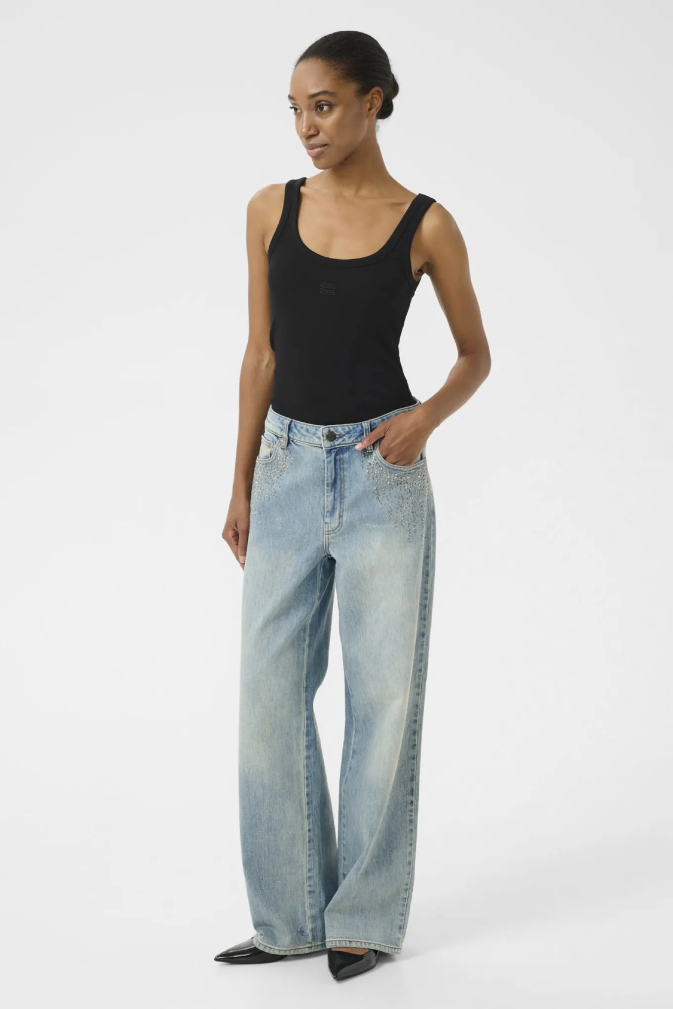OBS! Fjernlager. Levering kan blive forlænget med 2-3 dage, hvis varen ikke findes i vores butik lige nu.Super smarte jeans fra Gestuz med vidde i benene, et straight-leg snit og de skønneste similisten omkring forlommerne.