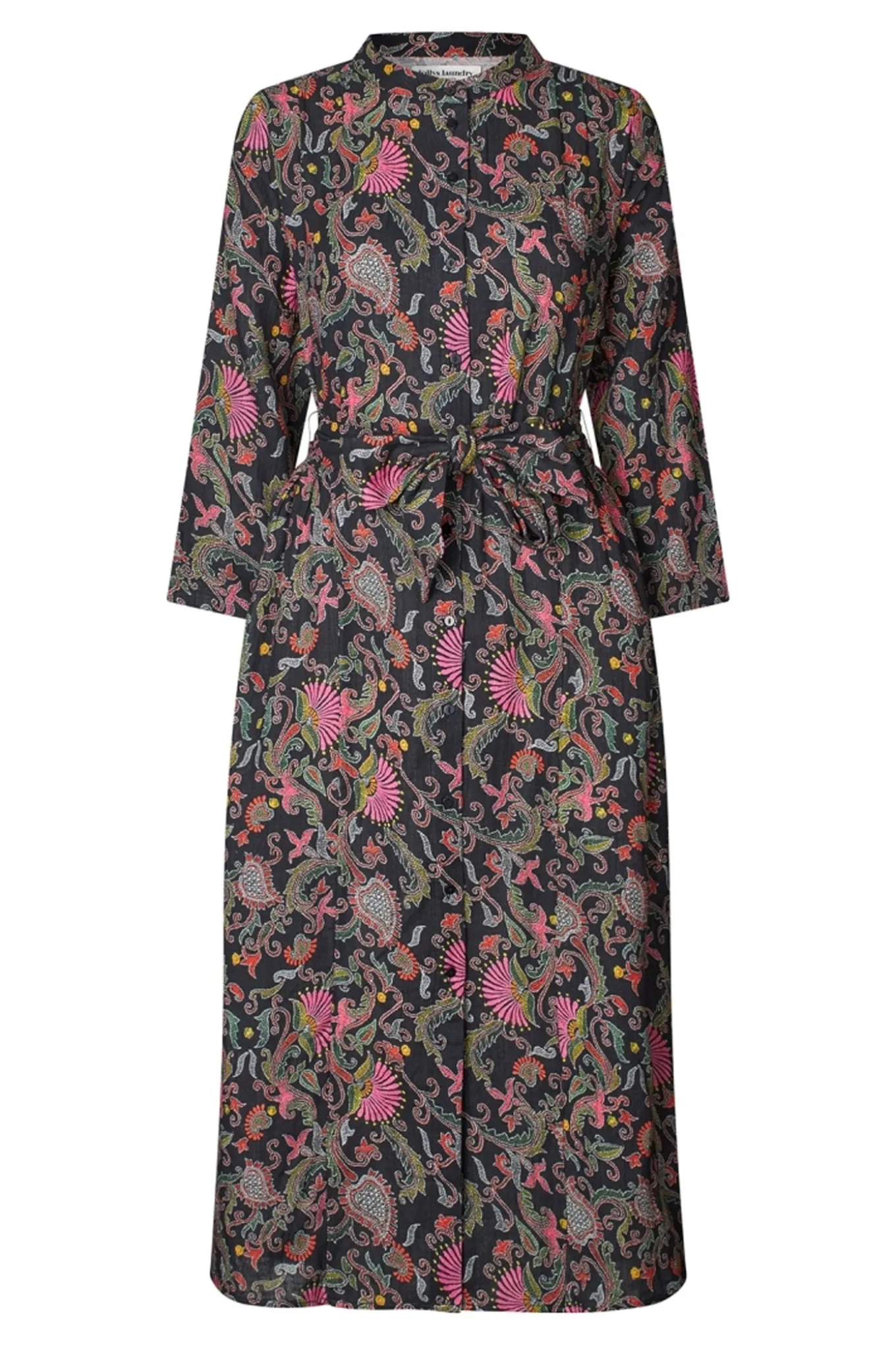 Smuk maxi kjole fra Lollys Laundry med ¾ lange ærmer, kinakrave i halsen og skjult knaplukning langs fronten. Kjolen har også den smukkeste kvalitet og kommer med et bredt bindebælte i taljen.