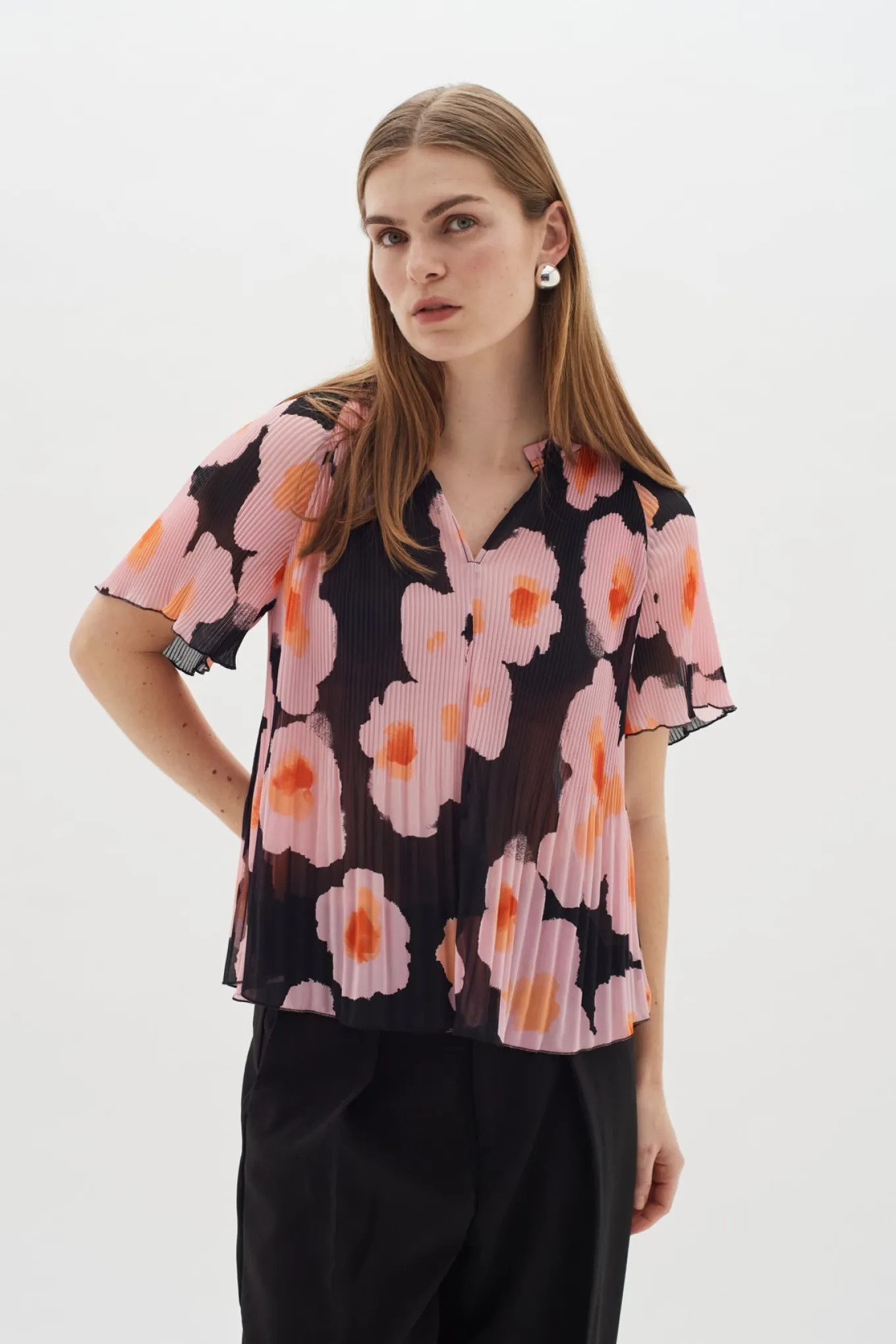 Få et blødt og feminint look med denne bluse fra INWEAR. Blusen er lavet af 100% genanvendt polyester og har et smukt pink poetisk blomsterprint. Perfekt til enhver lejlighed.