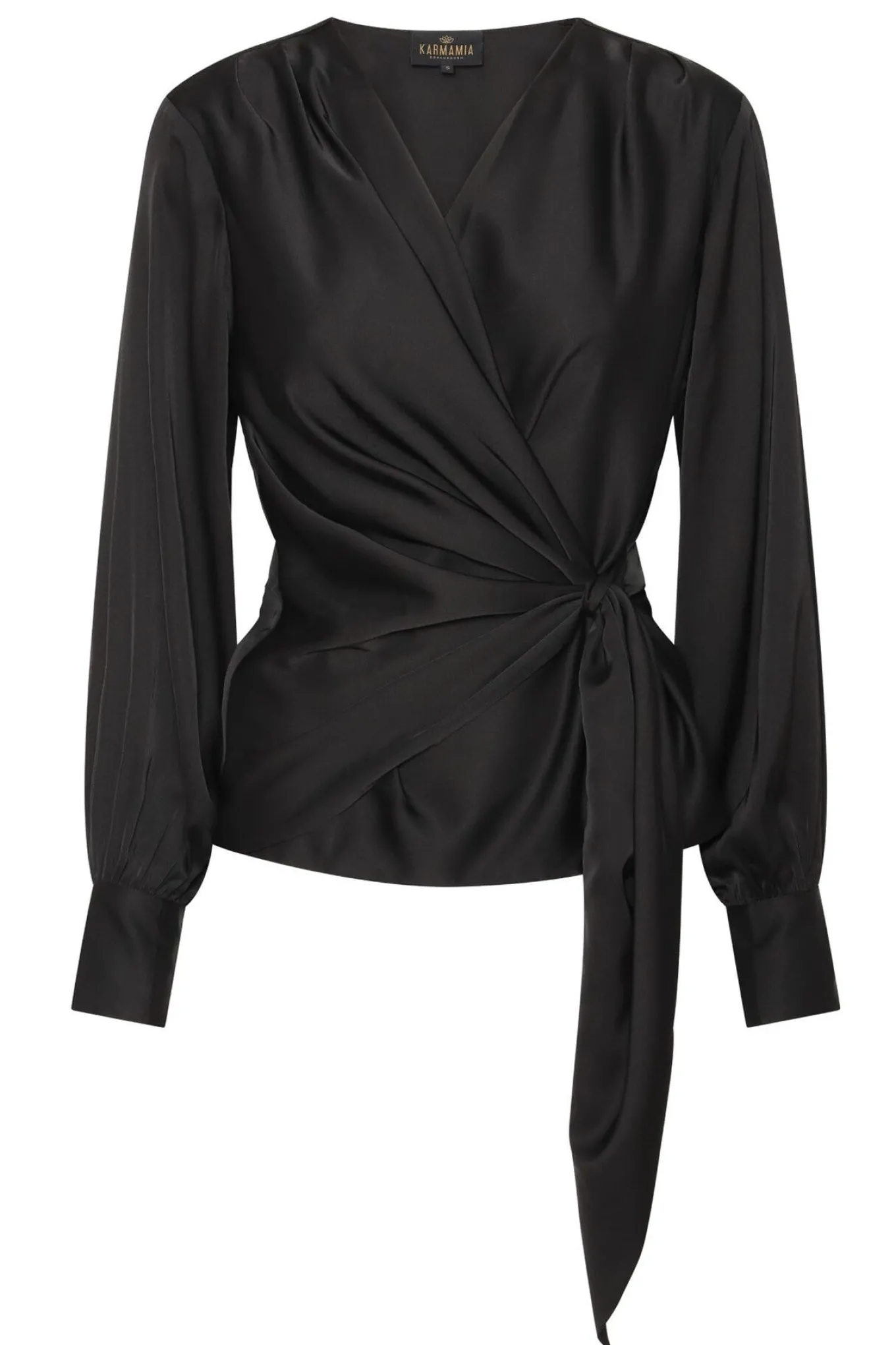 Feminin og stilren bluse fra Karmamia med lange ærmer og en smuk draperet effekt der bindes i siden og fremhæver din figur. Blusen har også brede manchetter omkring håndleddene og en dejlig blød kvalitet.