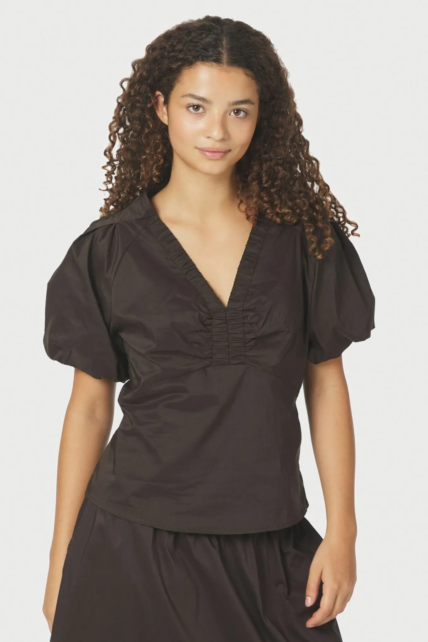 Denne bluse fra NEO NOIR er perfekt til et klassisk og tidløst look. I en smuk chocolate brown farve og lavet af en blanding af bomuld, nylon og elastan for komfort og holdbarhed.
