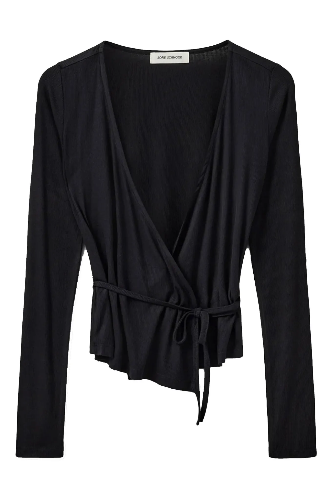 - OBS! Fjernlager. Levering kan blive forlænget med 2-3 dage, hvis varen ikke findes i vores butik lige nu.Fin slå-om bluse fra Sofie Schnoor med lange ærmer, dyb v-udskæring i halsen og et smalt bindebånd i taljen.