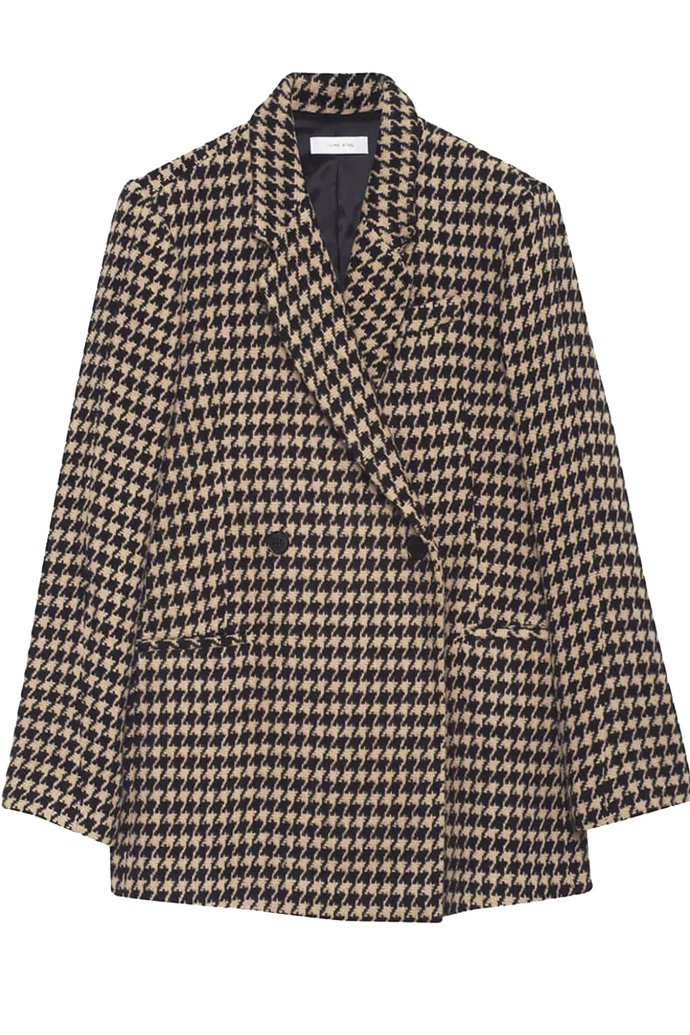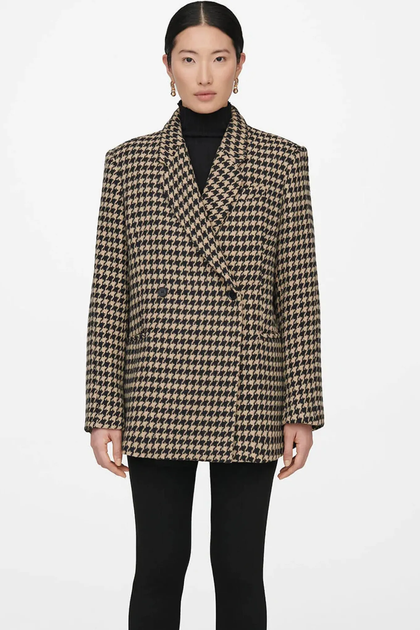 Flot blazer fra Anine Bing med et klassisk houndstooth mønster, lange ærmer og flot krave om halsen. Blazeren har en skræddersyet silhuet og lukkes med en knap i fronten.