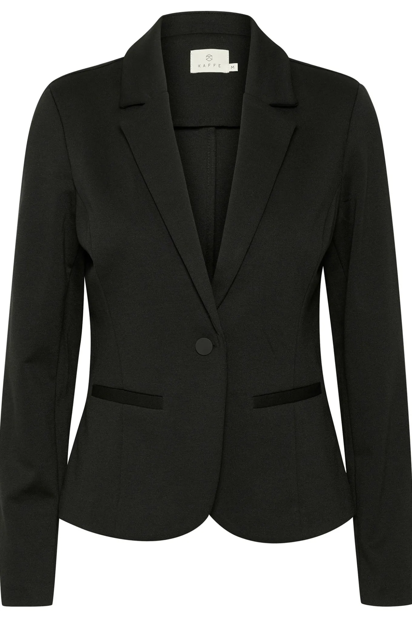 OBS! Fjernlager. Levering kan blive forlænget med 2-3 dage, hvis varen ikke findes i vores butik lige nu.Flot blazer fra Kaffe med lange ærmer, en klassisk krave om halsen og en stor knap til at lukke med i fronten.