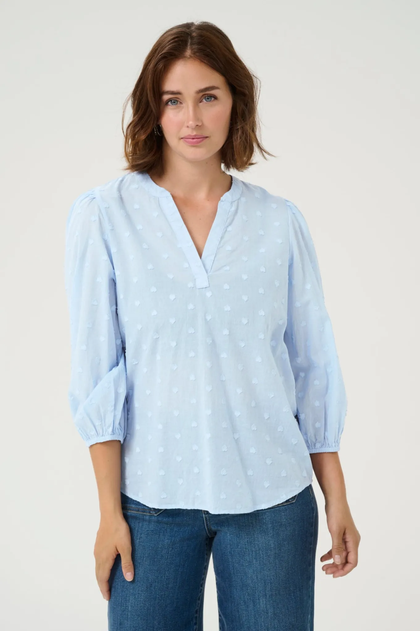 Opgrader din garderobe med denne bløde chambray bluse fra Kaffe. Lavet af 100% bomuld, er den perfekt til ethvert outfit.
