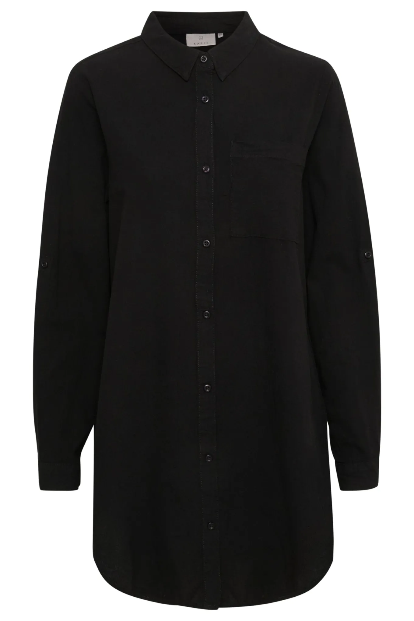 OBS! Fjernlager. Levering kan blive forlænget med 2-3 dage, hvis varen ikke findes i vores butik lige nu.Smart tunika fra Kaffe med lange ærmer, en lille krave i halsen og en fin lomme på brystet.Tunikaen har også afrundede kanter, en afslappet pasform og knaplukning langs fronten.